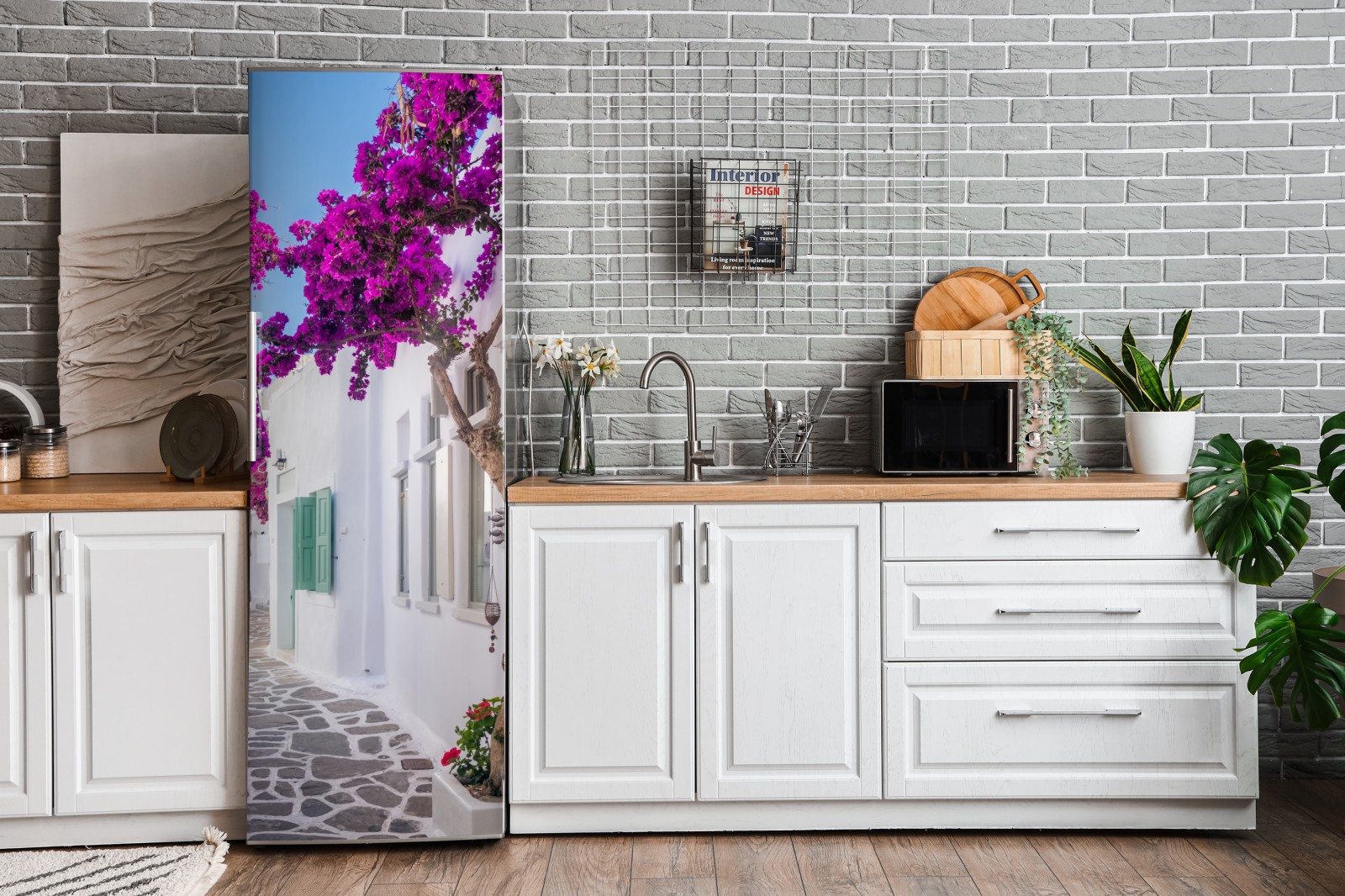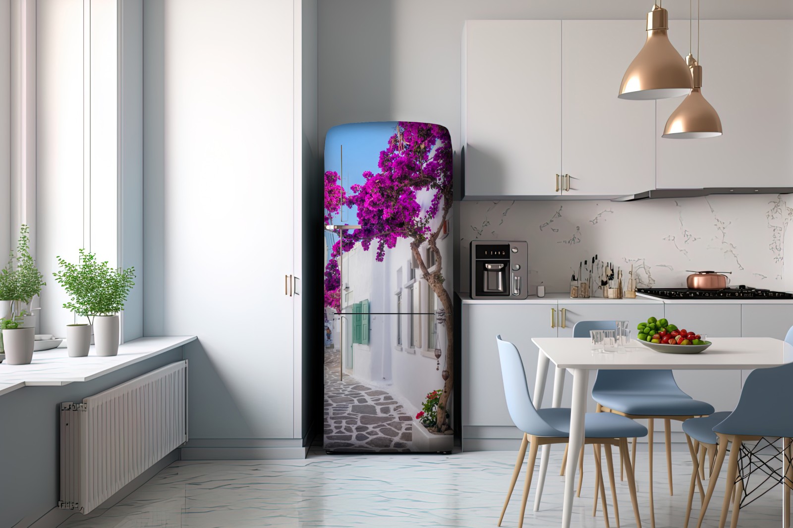 Naklejka na lodówkę Słoneczna śródziemnomorska uliczka z bugenwillą