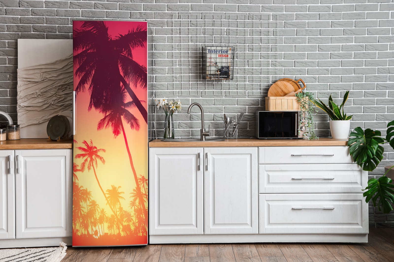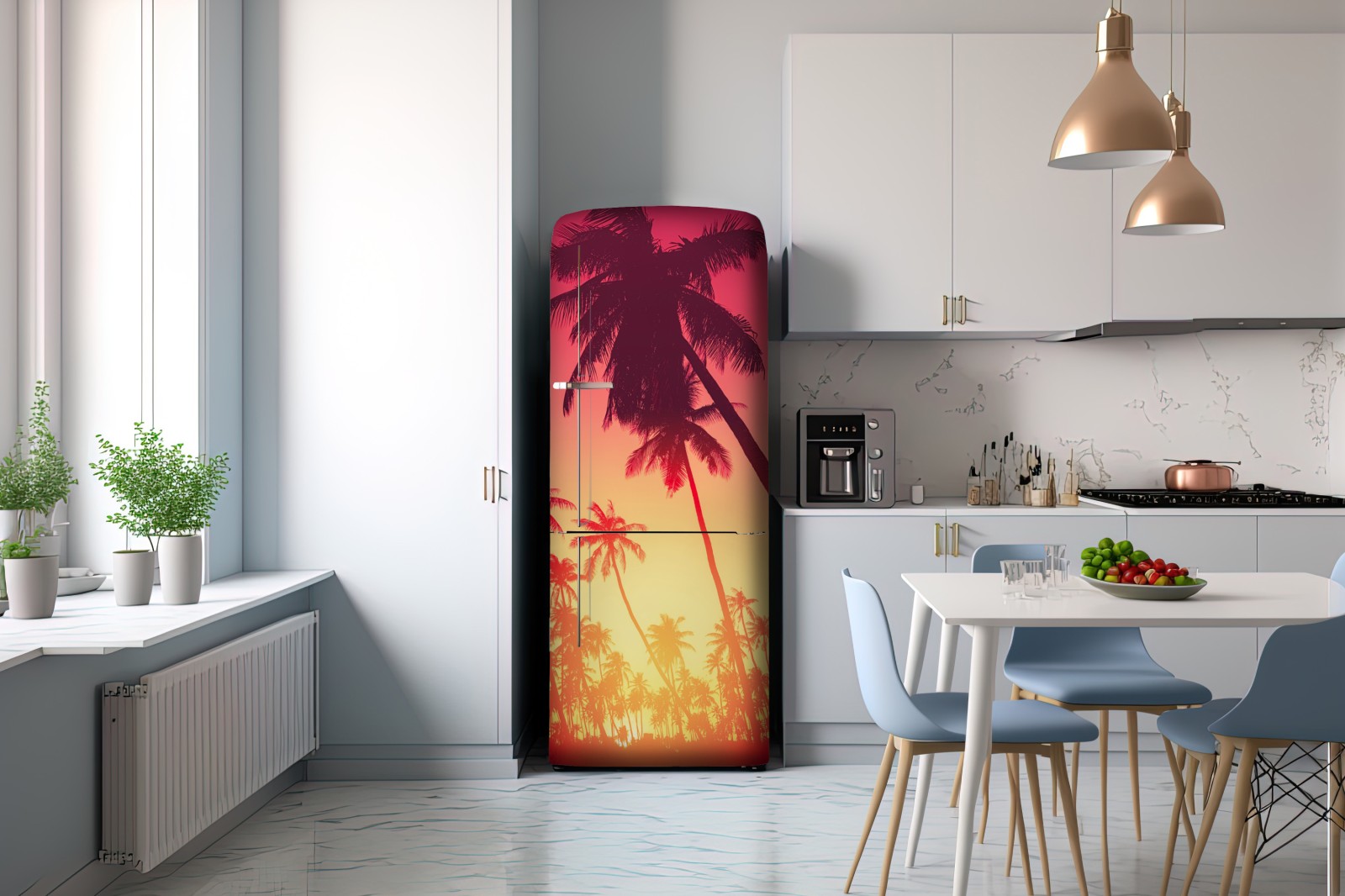 Naklejka na lodówkę Tropikalny zachód słońca z palmami