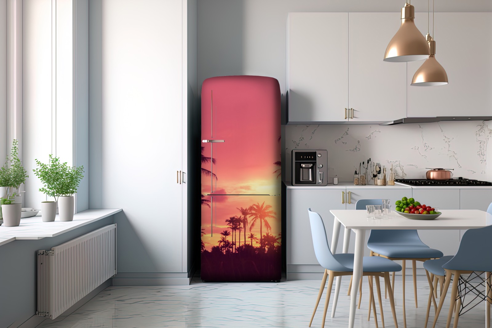 Naklejka na lodówkę Różowy tropikalny zachód słońca z palmami