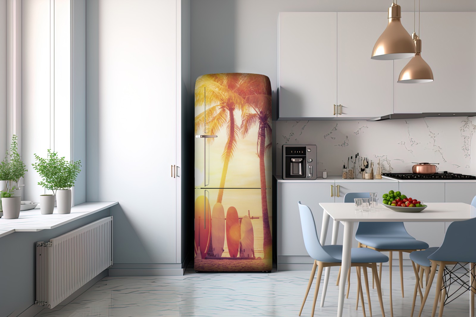 Naklejka na lodówkę Tropikalny zachód słońca z deskami surfingowymi