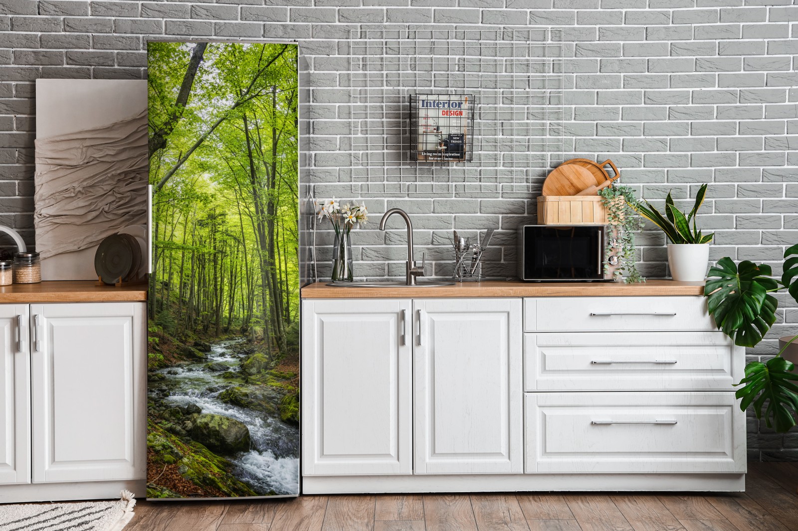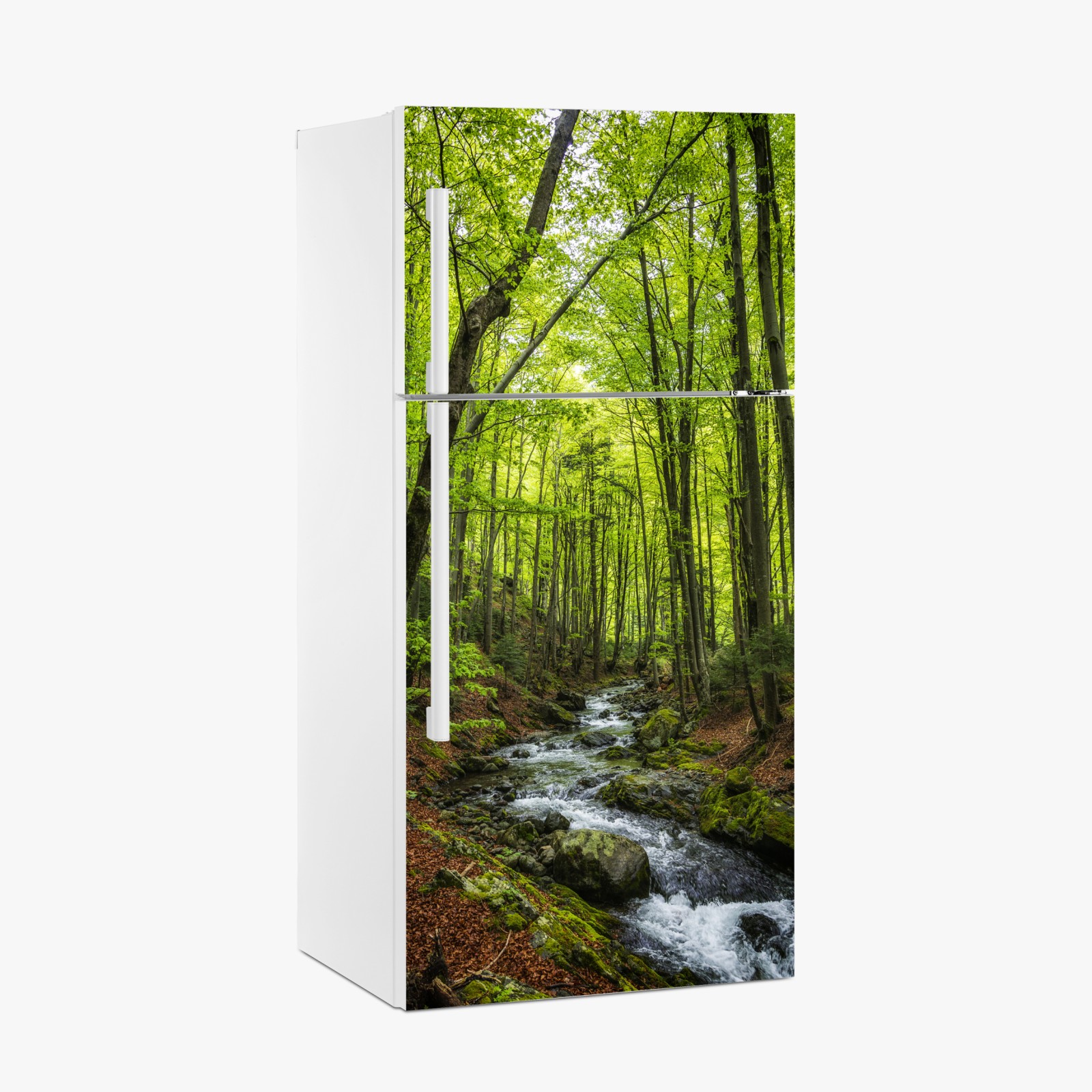 Wprowadź spokój lasu do wnętrza dzięki temu żywemu zielonemu zdjęciu strumienia, idealnemu jako naturalny akcent dekoracyjny.