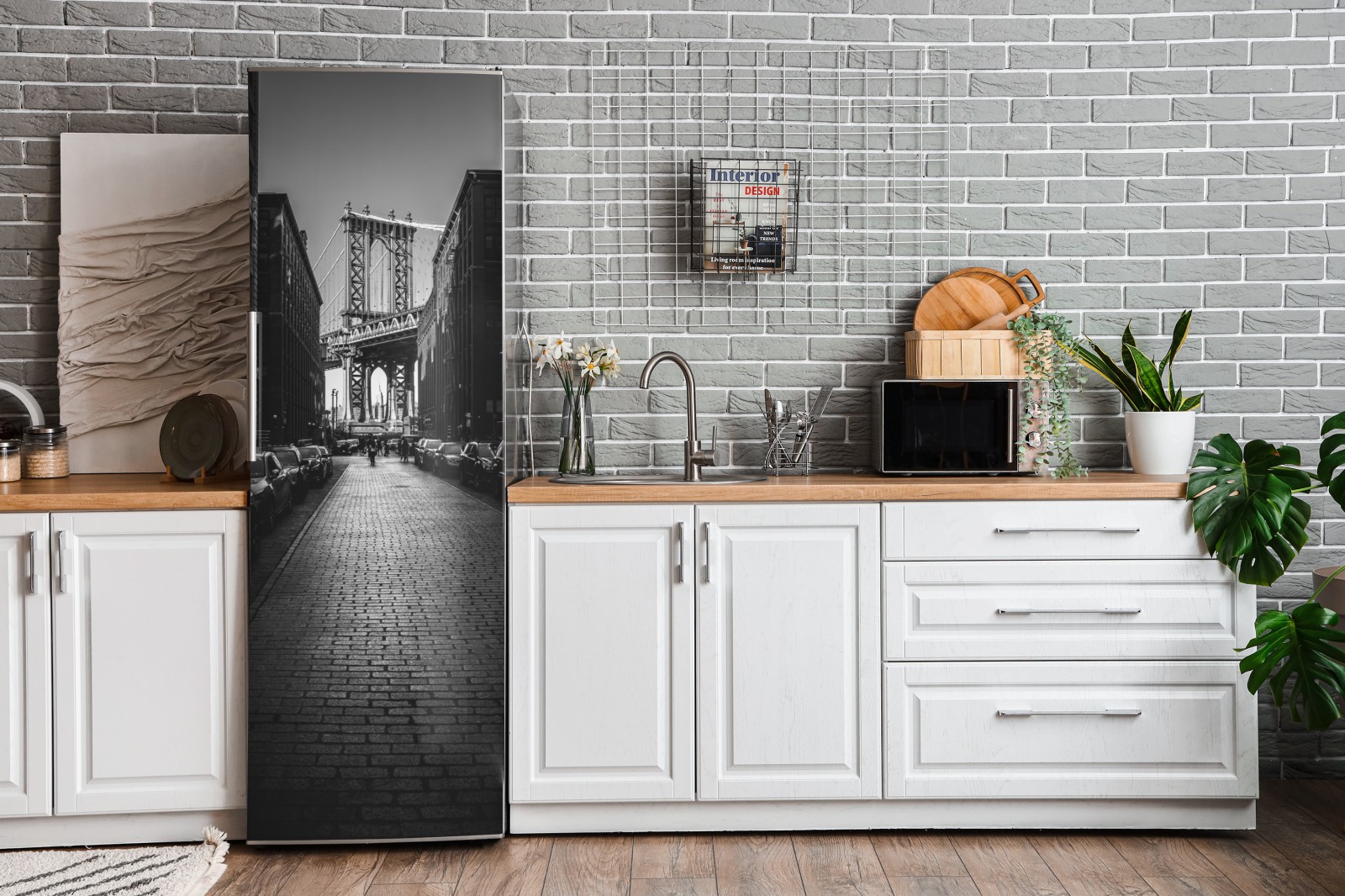 Naklejka na lodówkę Most Manhattan w kadrze brukowanej ulicy