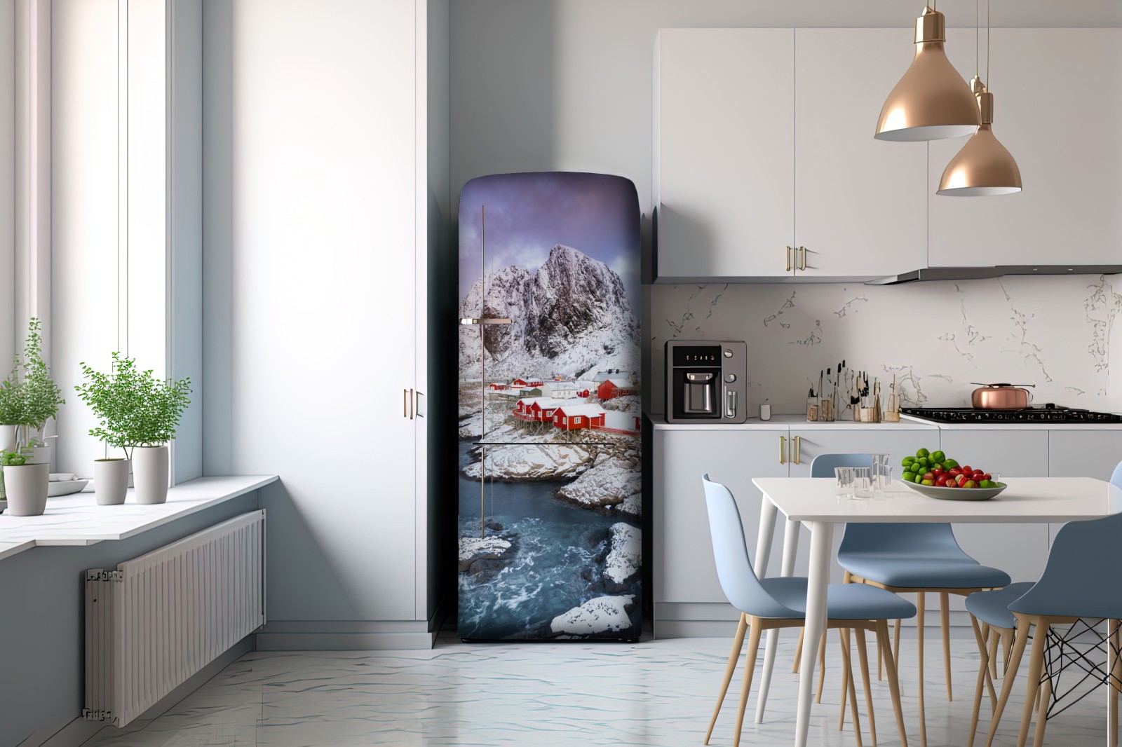 Naklejka na lodówkę Czerwone domki nad zaśnieżoną górą