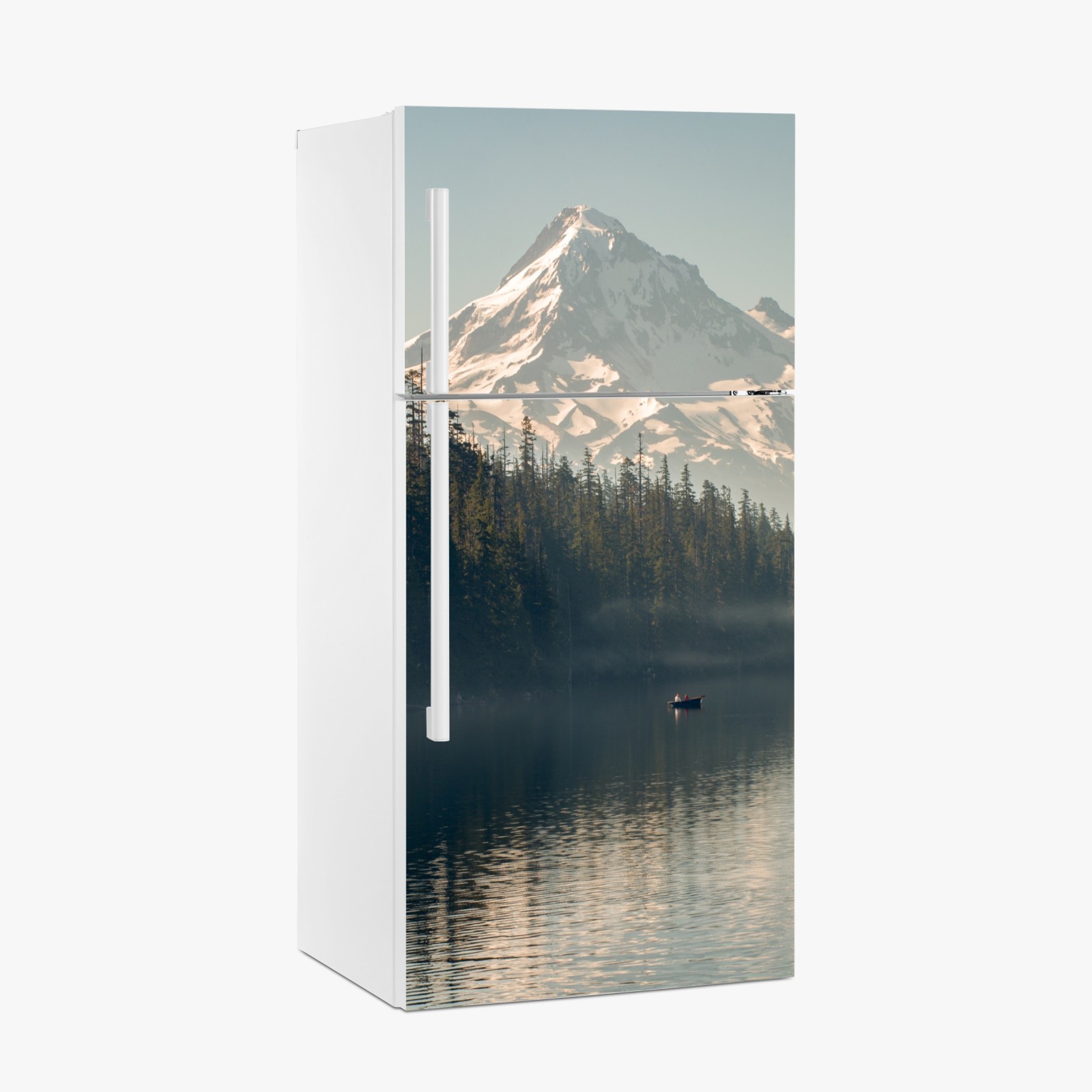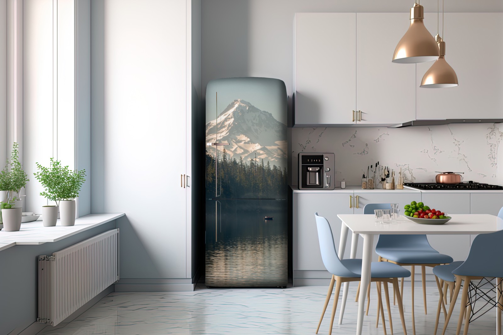 Naklejka na lodówkę Śnieżna góra nad spokojnym jeziorem