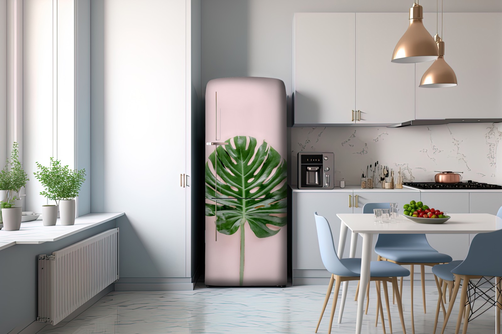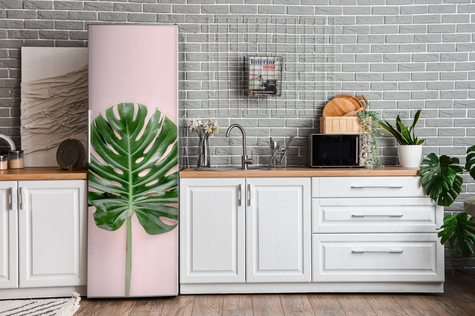Naklejka na lodówkę Liść monstera na pastelowym różowym tle