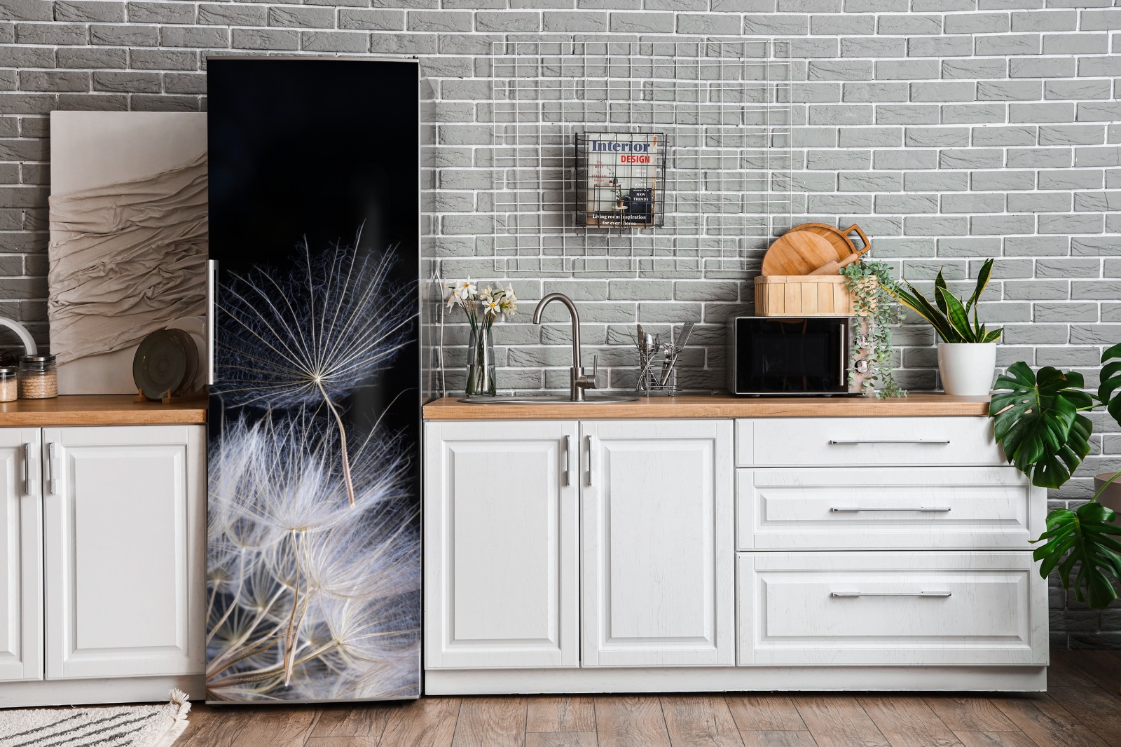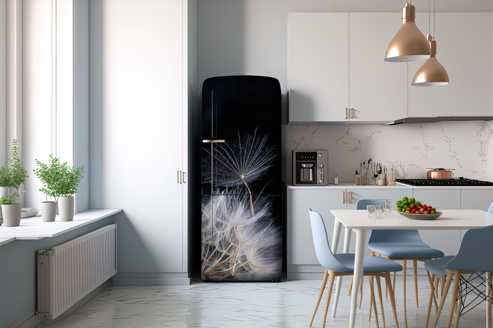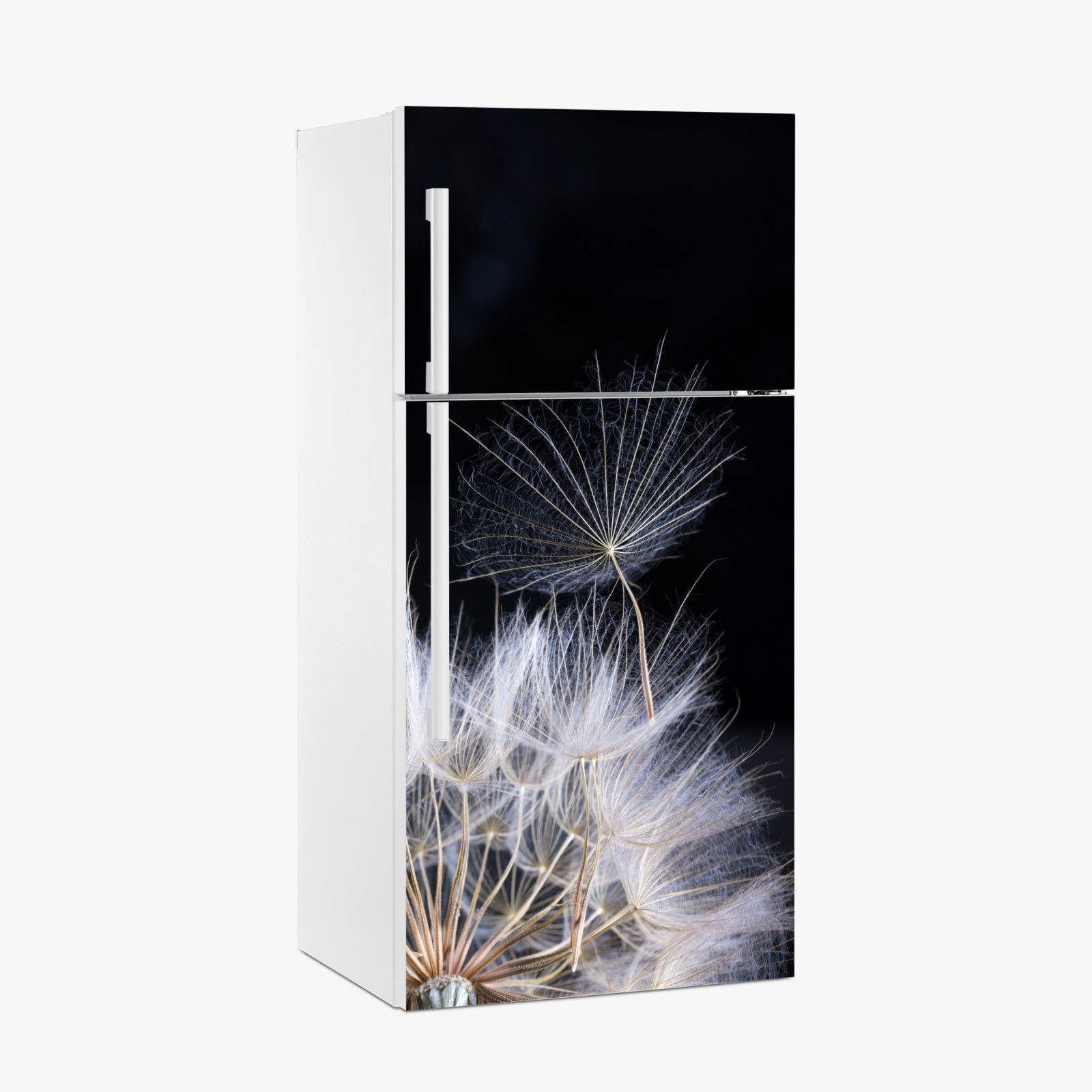 Naklejka na lodówkę Delikatne ziarno mniszka na czarnym tle