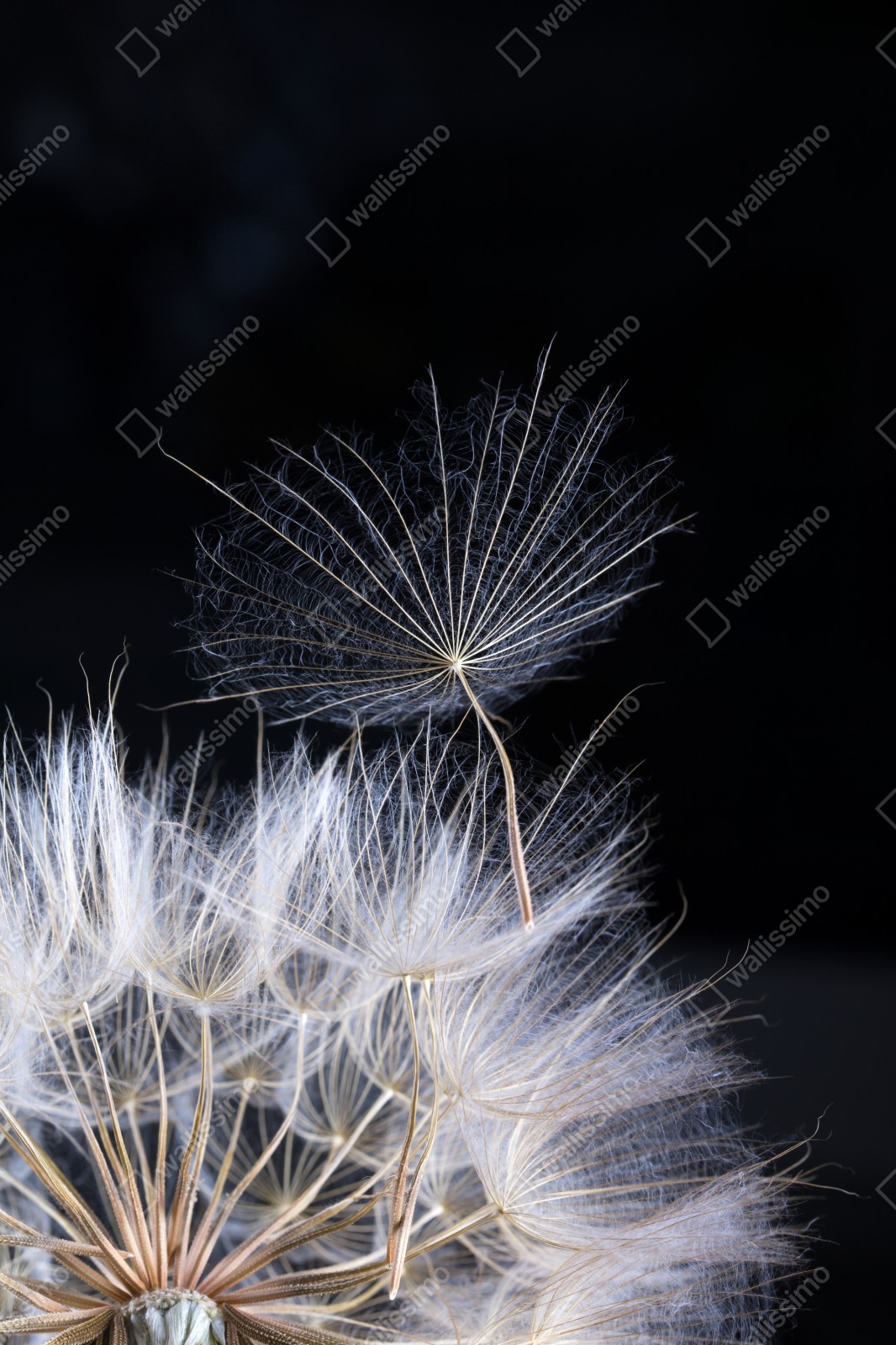 Delikatne ziarno mniszka uchwycone w szczegółach na głębokim czarnym tle, idealne do minimalistycznych wnętrz.