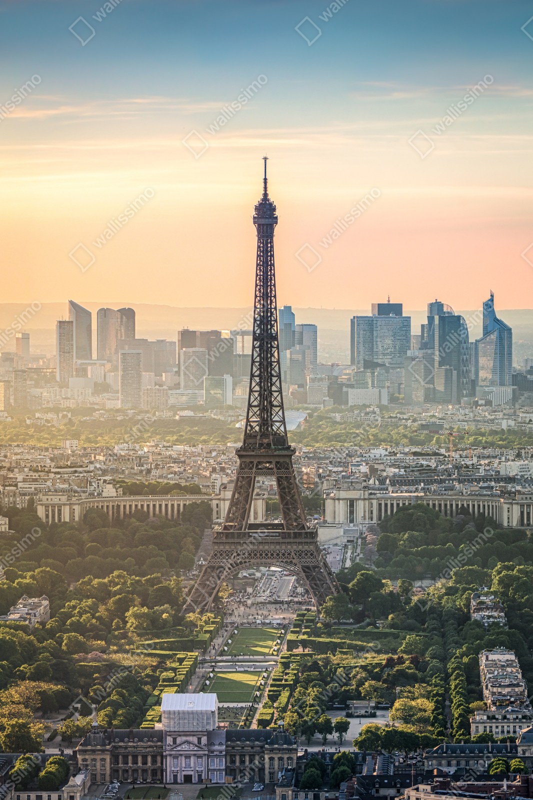 Podziwiaj ponadczasowy urok Paryża na tej fotografii z Wieżą Eiffla o zachodzie słońca.