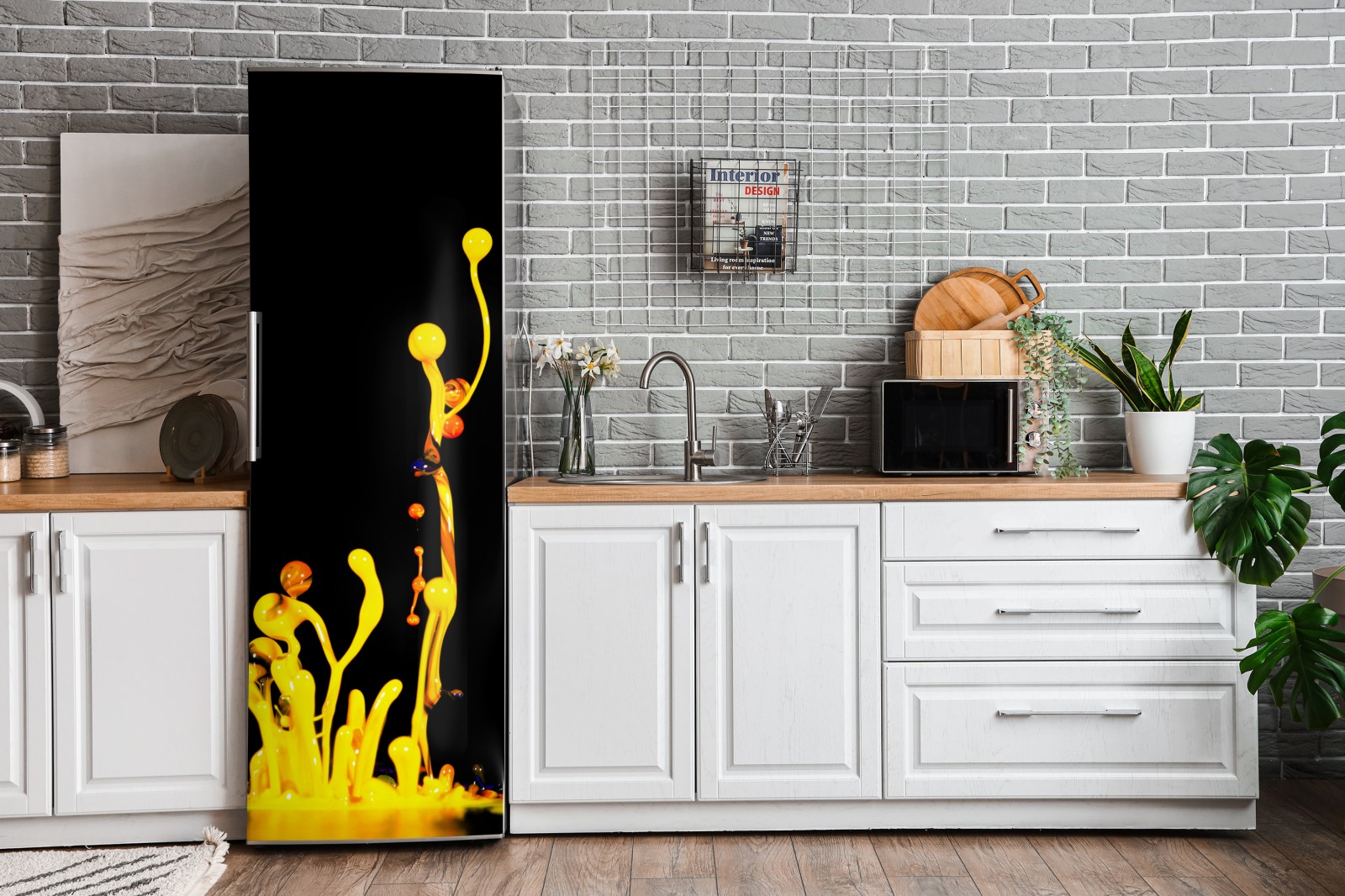Naklejka na lodówkę Intensywny żółty rozbryzg farby na czarnym tle