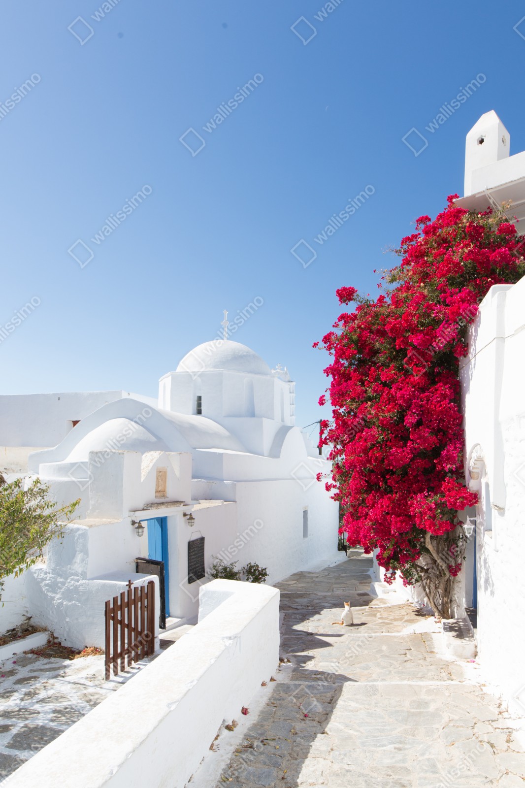 Wprowadź śródziemnomorski spokój do wnętrza dzięki zdjęciu białych domów i kwitnącej bugenwilli.