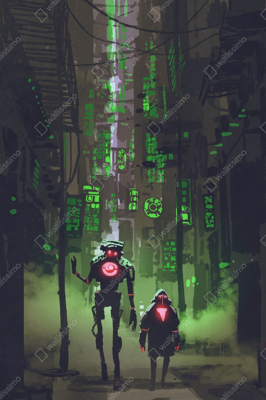Poczuj futurystyczny klimat miasta z postaciami robotów skąpanymi w zielonym świetle, idealny do wnętrz w stylu cyberpunk.