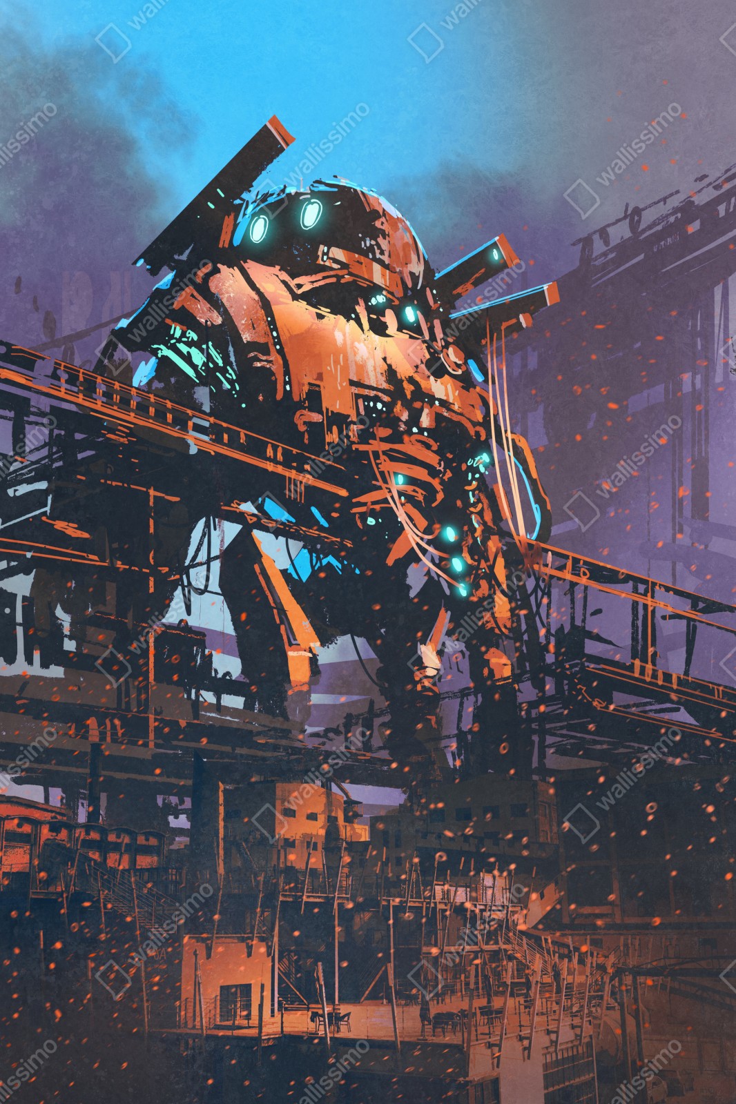 Dodaj industrialnego, science fiction charakteru do wnętrza dzięki ilustracji przedstawiającej ogromnego mecha w opuszczonej fabryce.