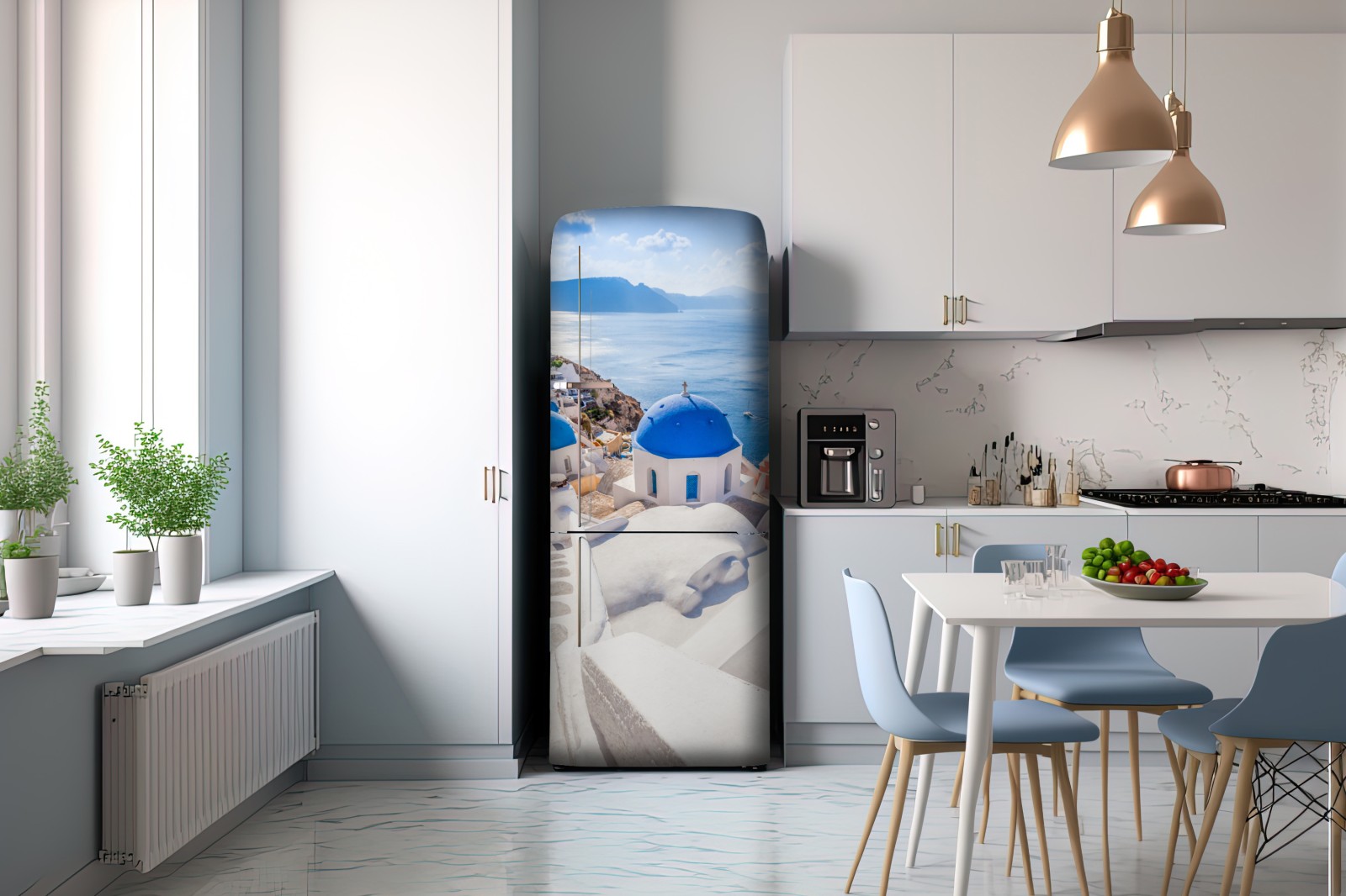Wprowadź do wnętrza spokojny widok na niebieskie kopuły Santorini i lśniące morze, emanujący śródziemnomorskim urokiem i ponadczasową architekturą.