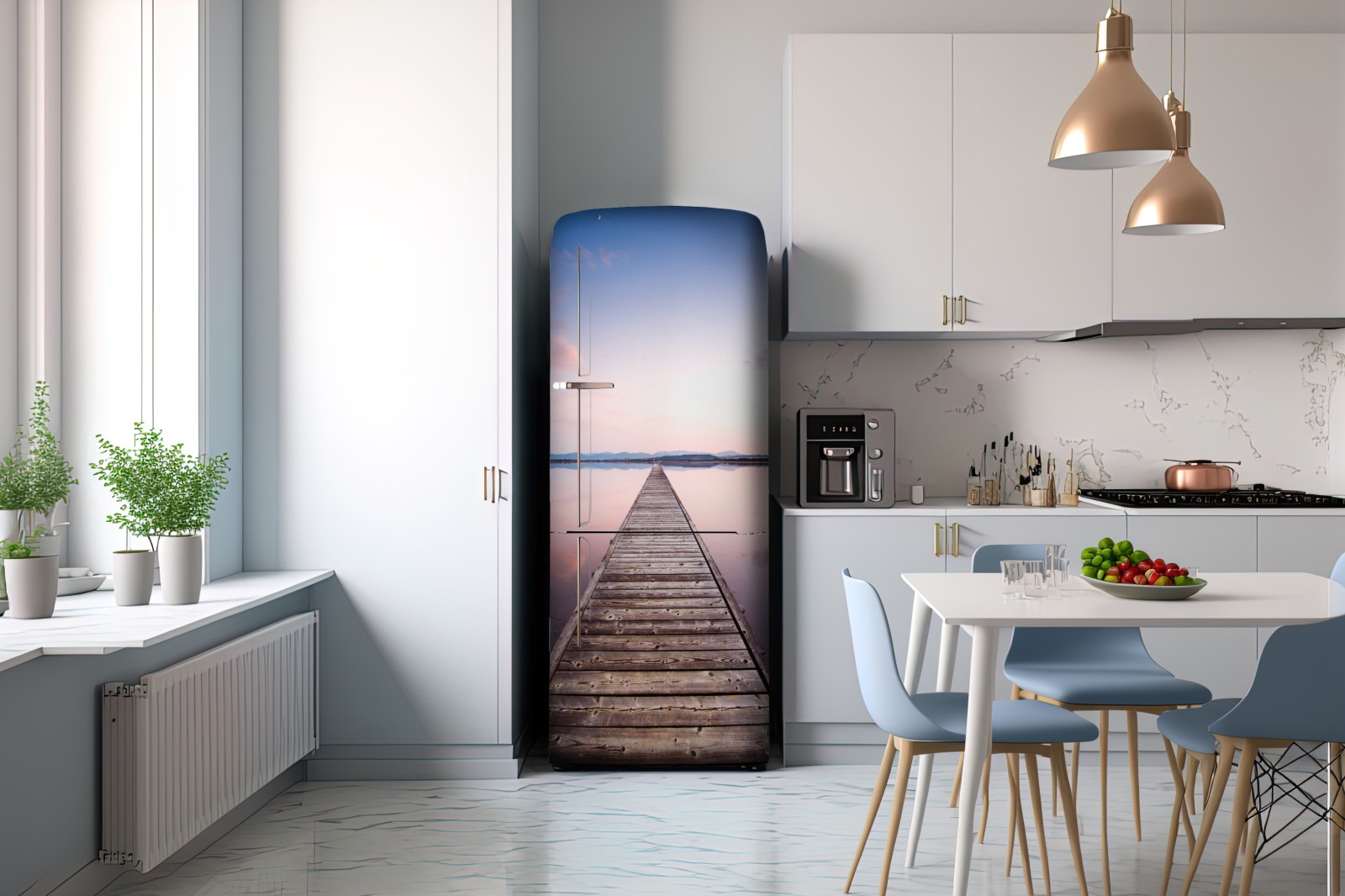 Naklejka na lodówkę Pomost prowadzący w stronę horyzontu o zachodzie słońca