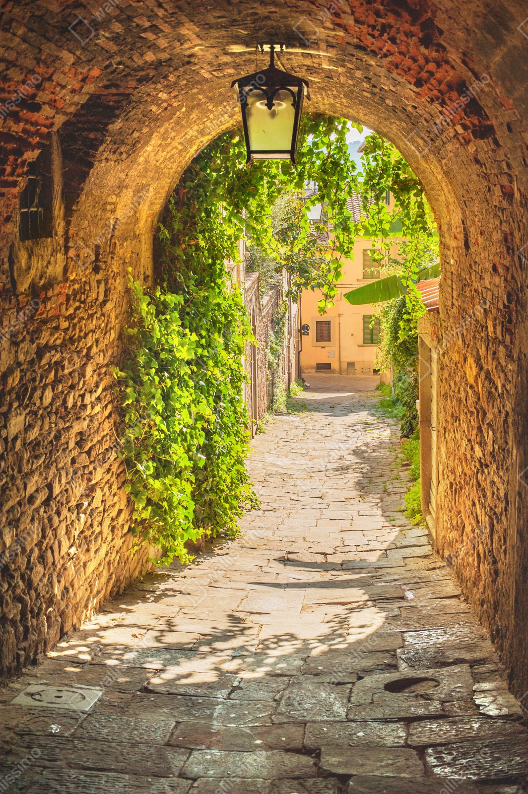 Dodaj do wnętrza klimat średniowiecznej toskańskiej uliczki z tym printem ukazującym kamienną drogę obsadzoną zielenią i rustykalnym urokiem.