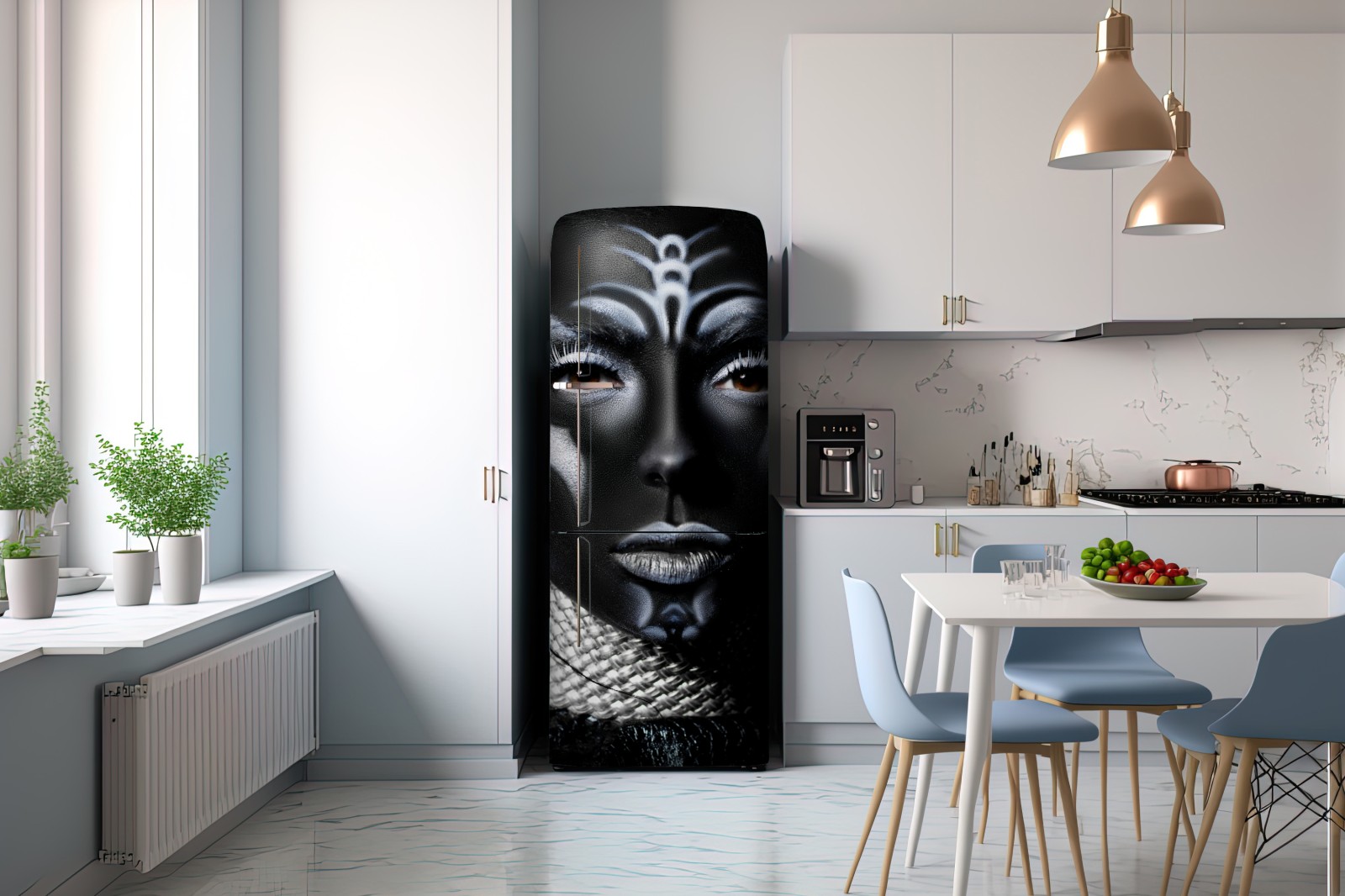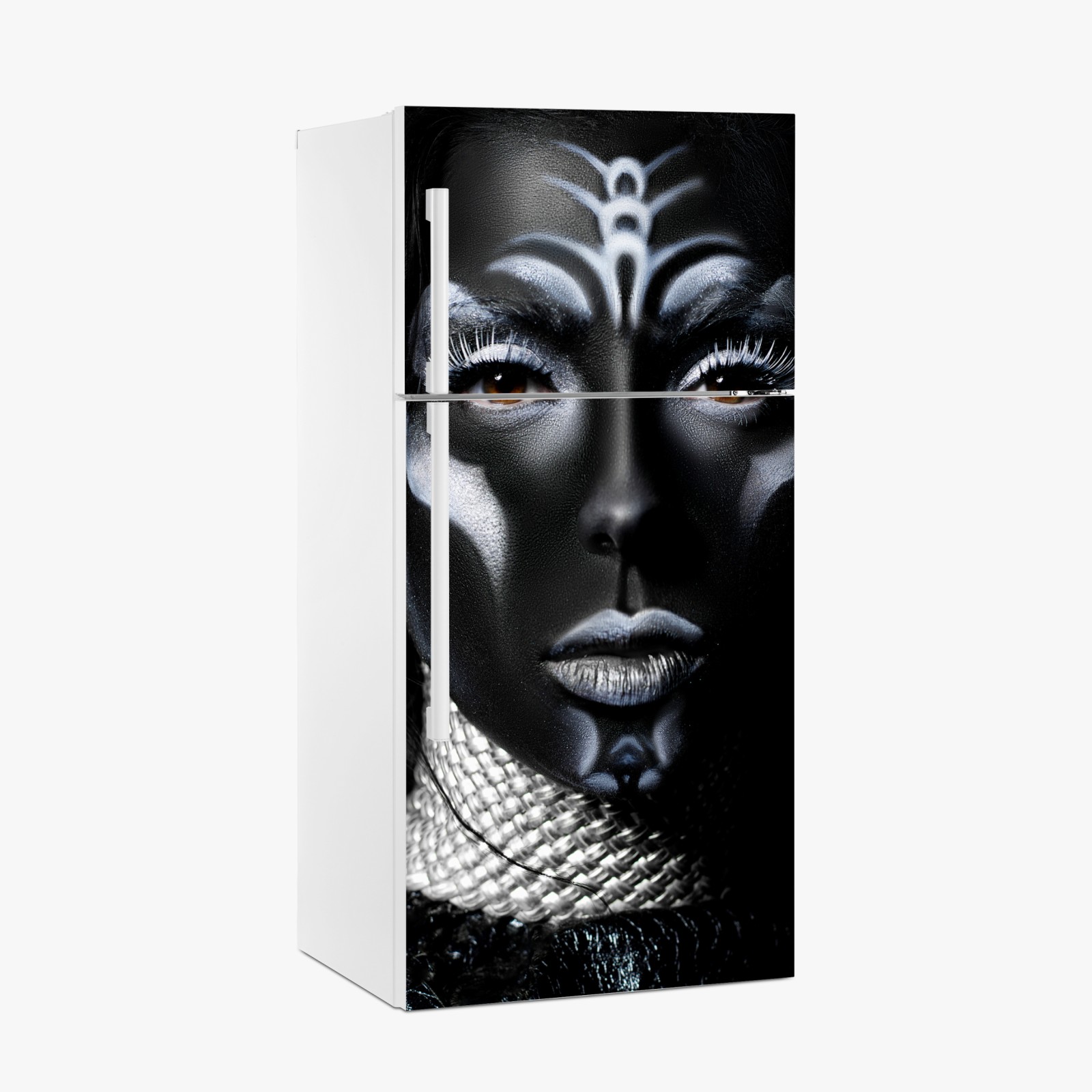 Wyrazisty zbliżeniowy portret z dramatycznym czarnym malowaniem ciała i kontrastującymi białymi detalami, idealny do nowoczesnych wnętrz.