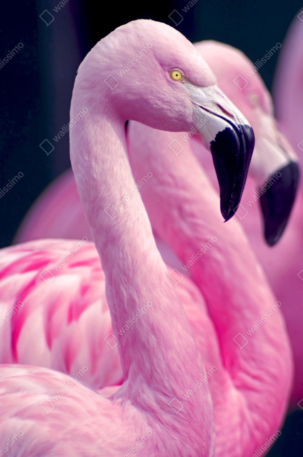 Dodaj tropikalnej elegancji do swojego wnętrza dzięki temu zbliżeniowemu portretowi dwóch różowych flamingów o intensywnych kolorach.