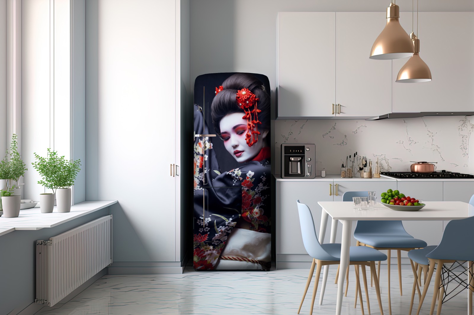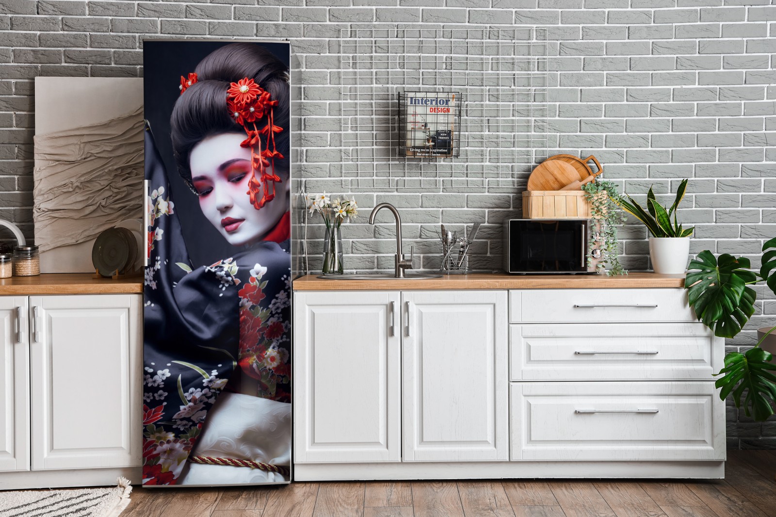 Naklejka na lodówkę Elegancki portret gejszy w czerwonym i czarnym kimonie