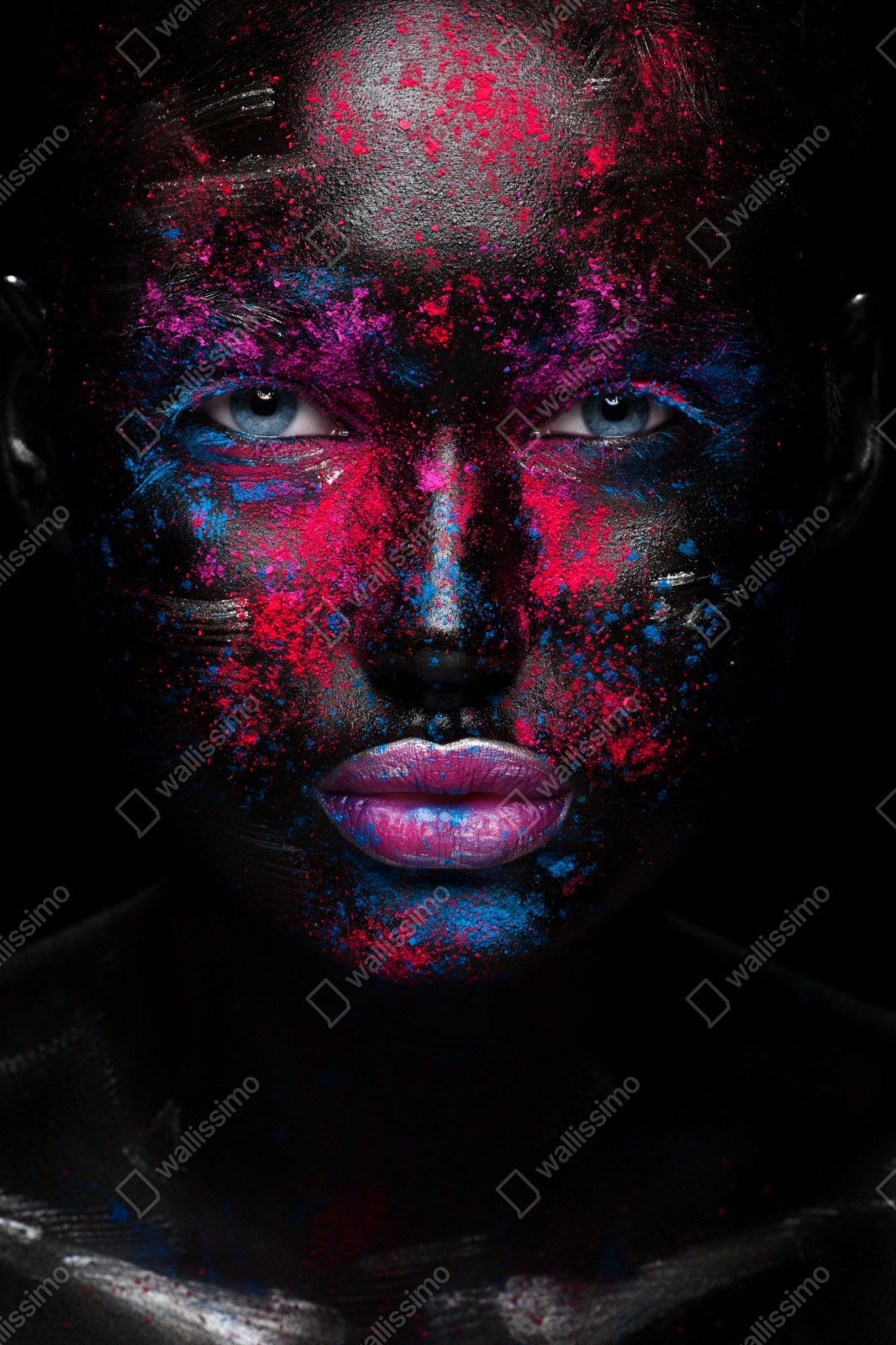 Wprowadź odważny kolor i nowoczesny charakter do wnętrza dzięki temu dramatycznemu neonowemu portretowi twarzy na głębokim czarnym tle.