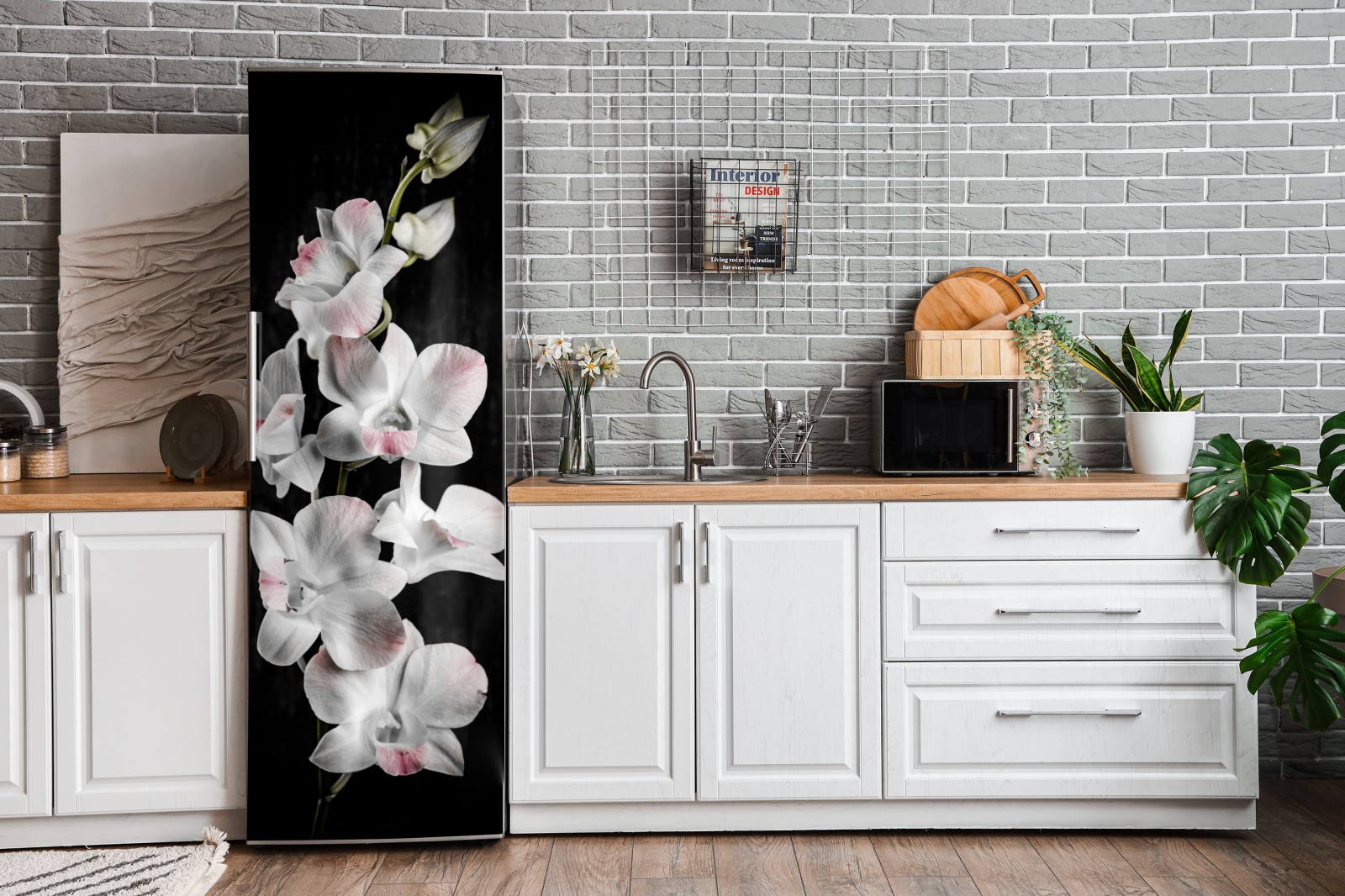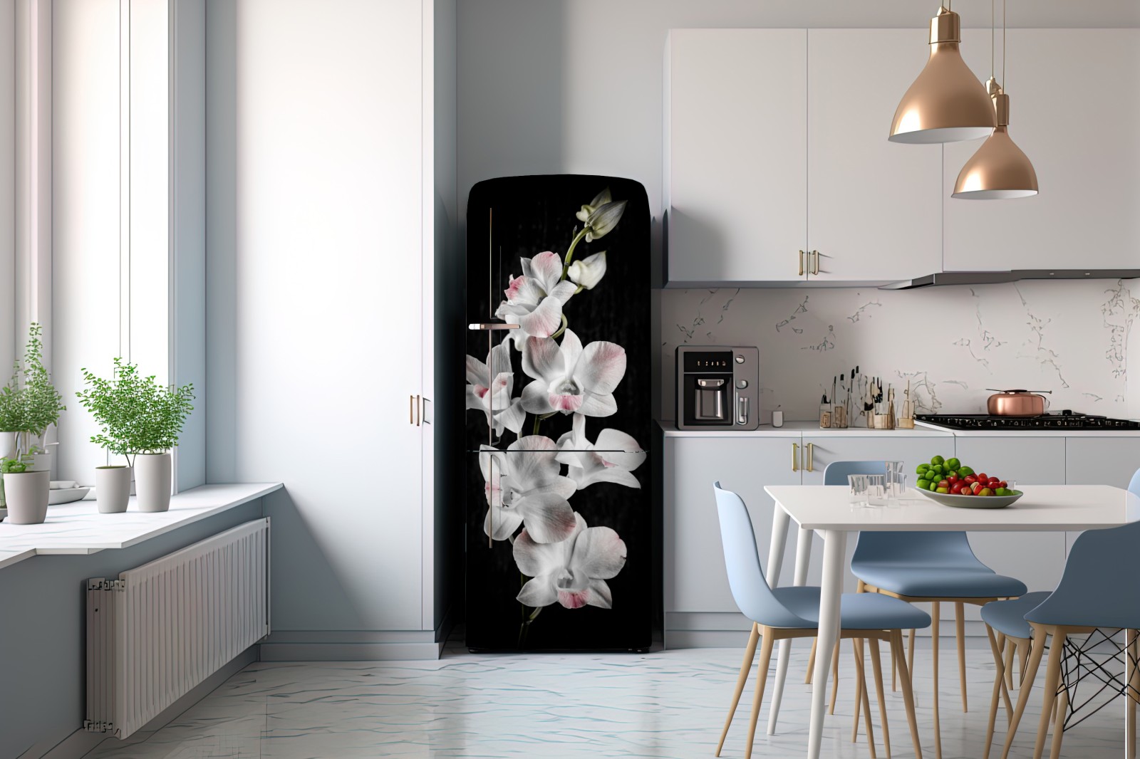 Naklejka na lodówkę Biały i różowy storczyk na czarnym tle
