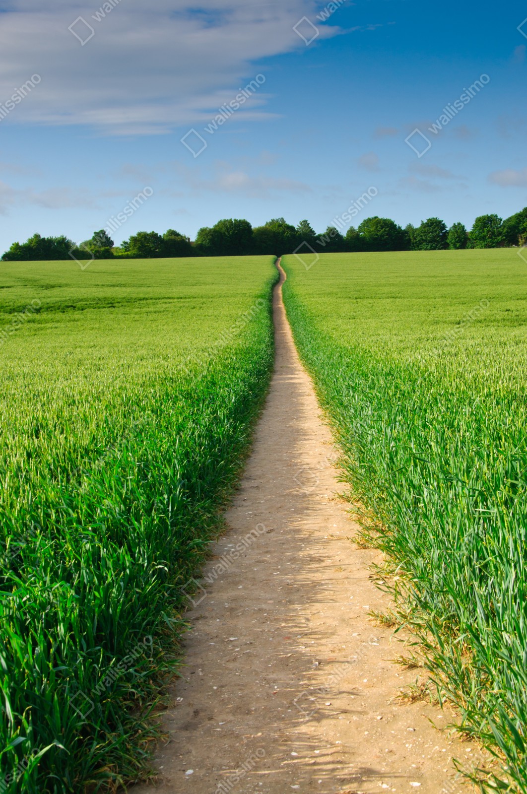 Wprowadź spokój i naturalne piękno do wnętrza dzięki zdjęciu przedstawiającemu słoneczną ścieżkę przez zieloną łąkę pod błękitnym niebem.