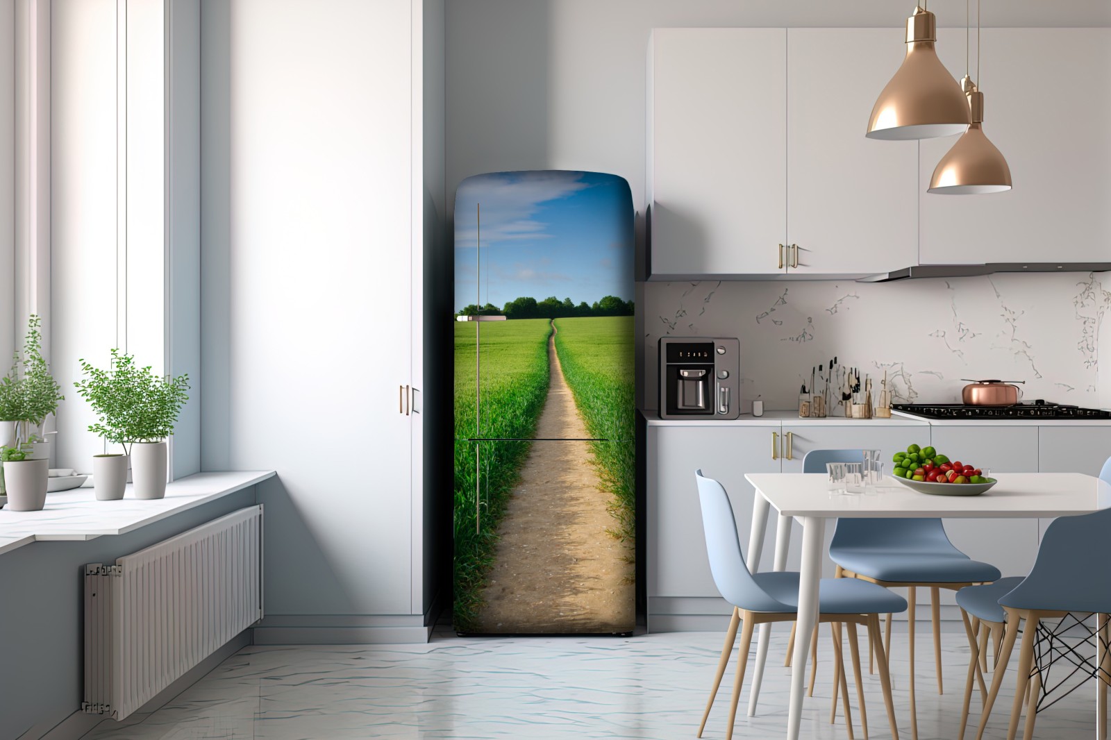 Naklejka na lodówkę Słoneczna ścieżka przez zieloną łąkę