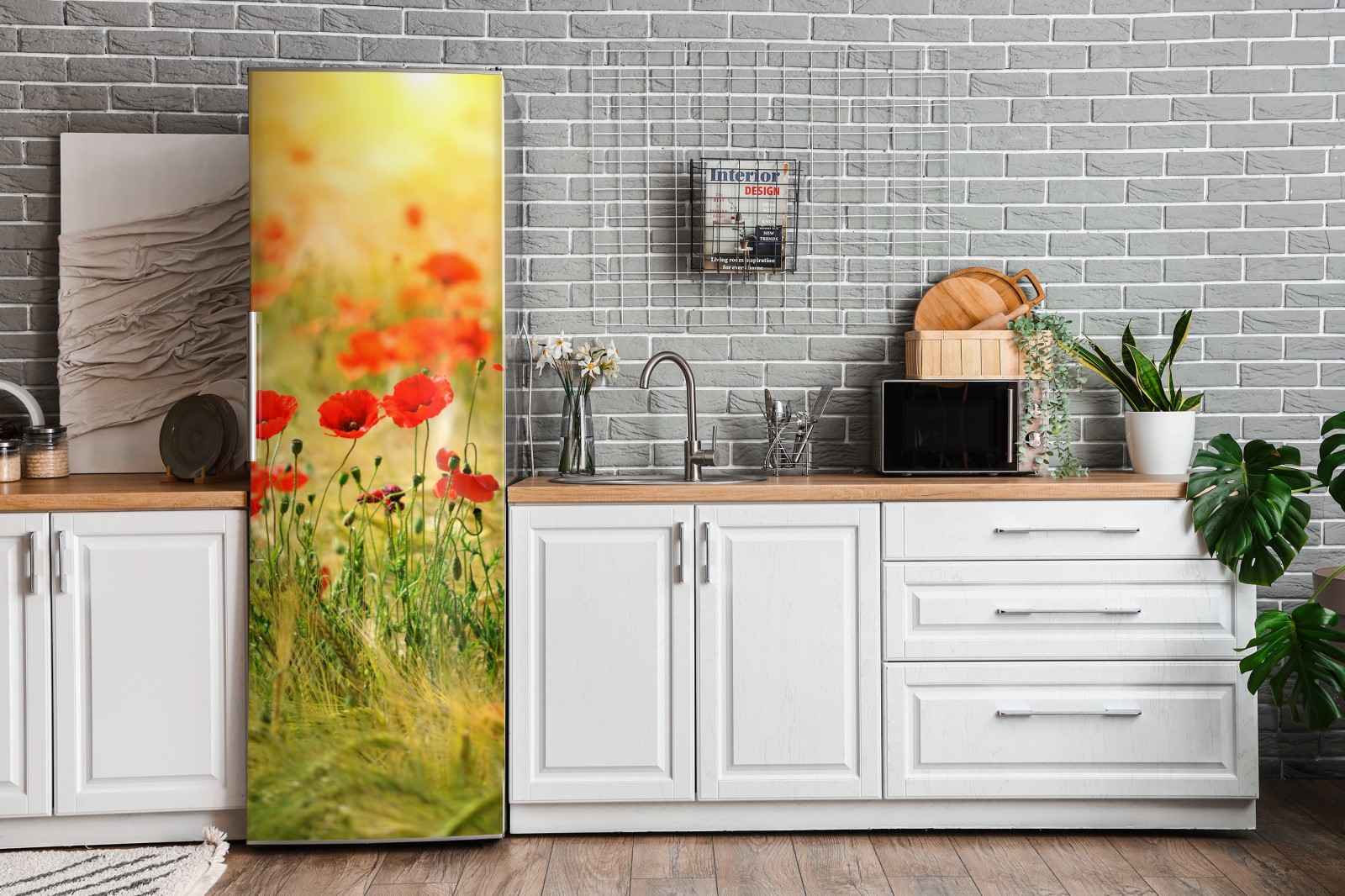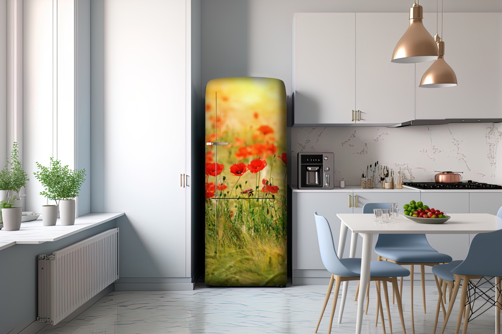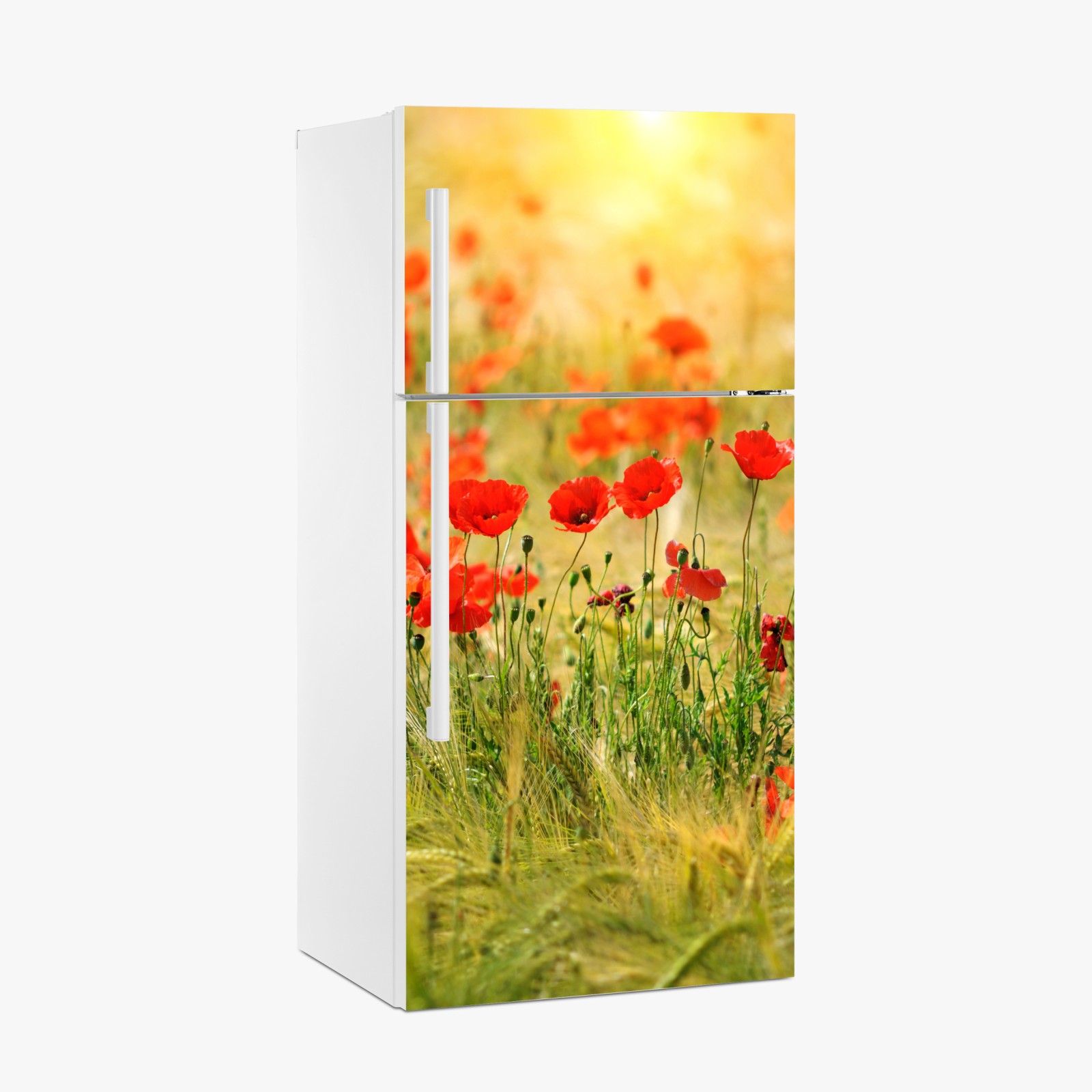 Naklejka na lodówkę Łąka czerwonych maków w słońcu