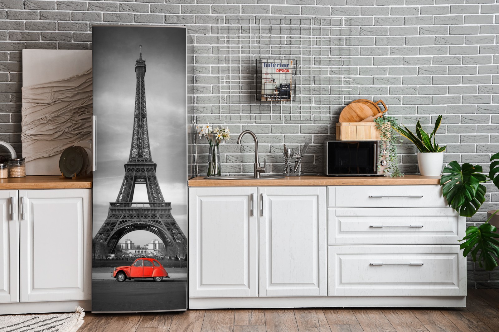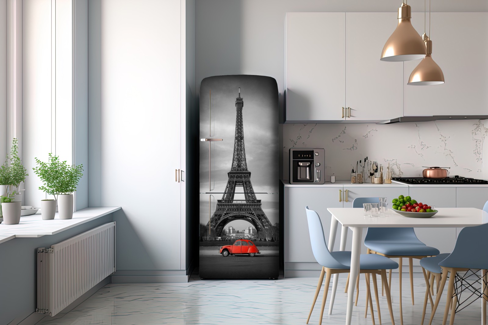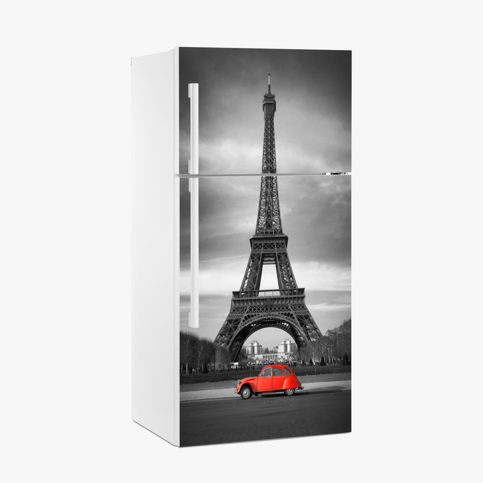 Naklejka na lodówkę Wieża Eiffla z czerwonym zabytkowym samochodem