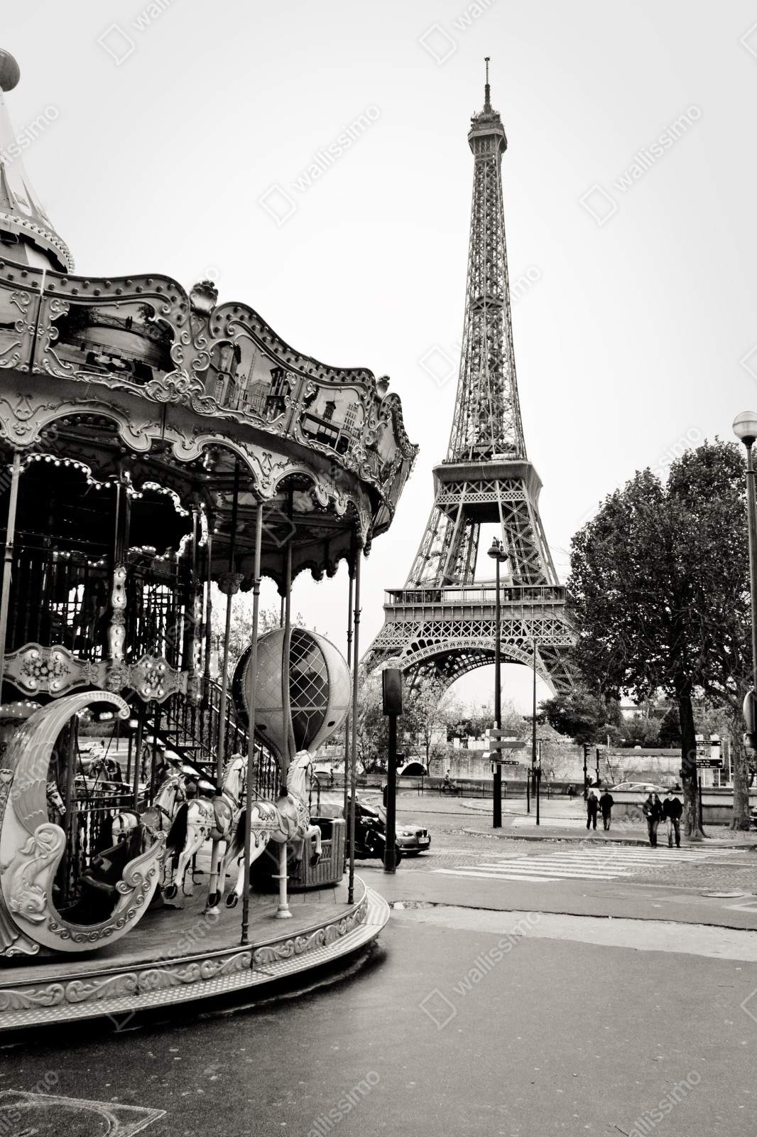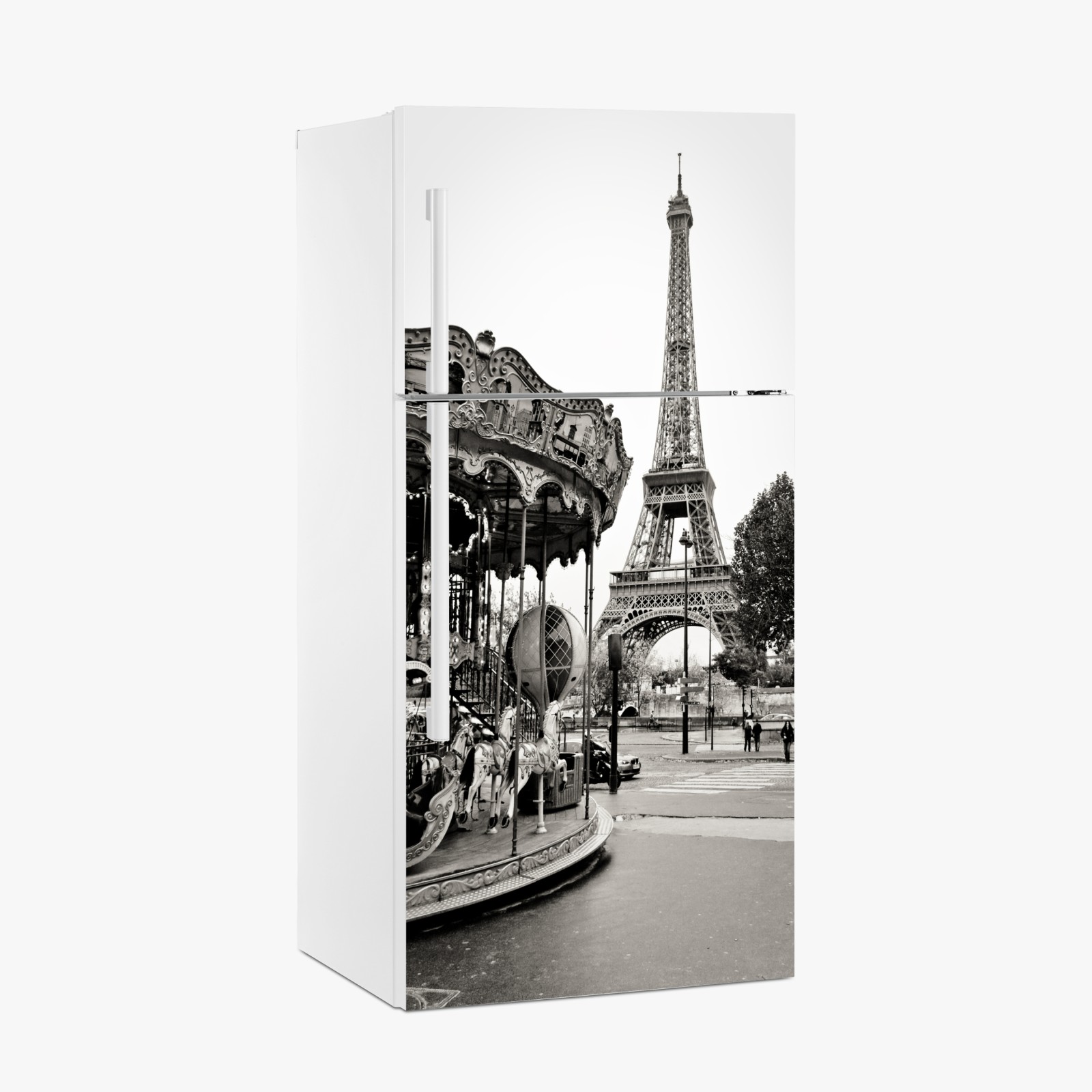 Dodaj ponadczasowego paryskiego uroku do wnętrza dzięki temu czarno-białemu zdjęciu z Wieżą Eiffla i karuzelą.