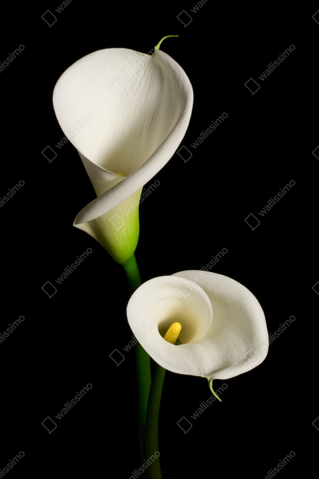 Dodaj elegancji wnętrzu dzięki białym kaliom na dramatycznym czarnym tle, idealne do minimalistycznych aranżacji.