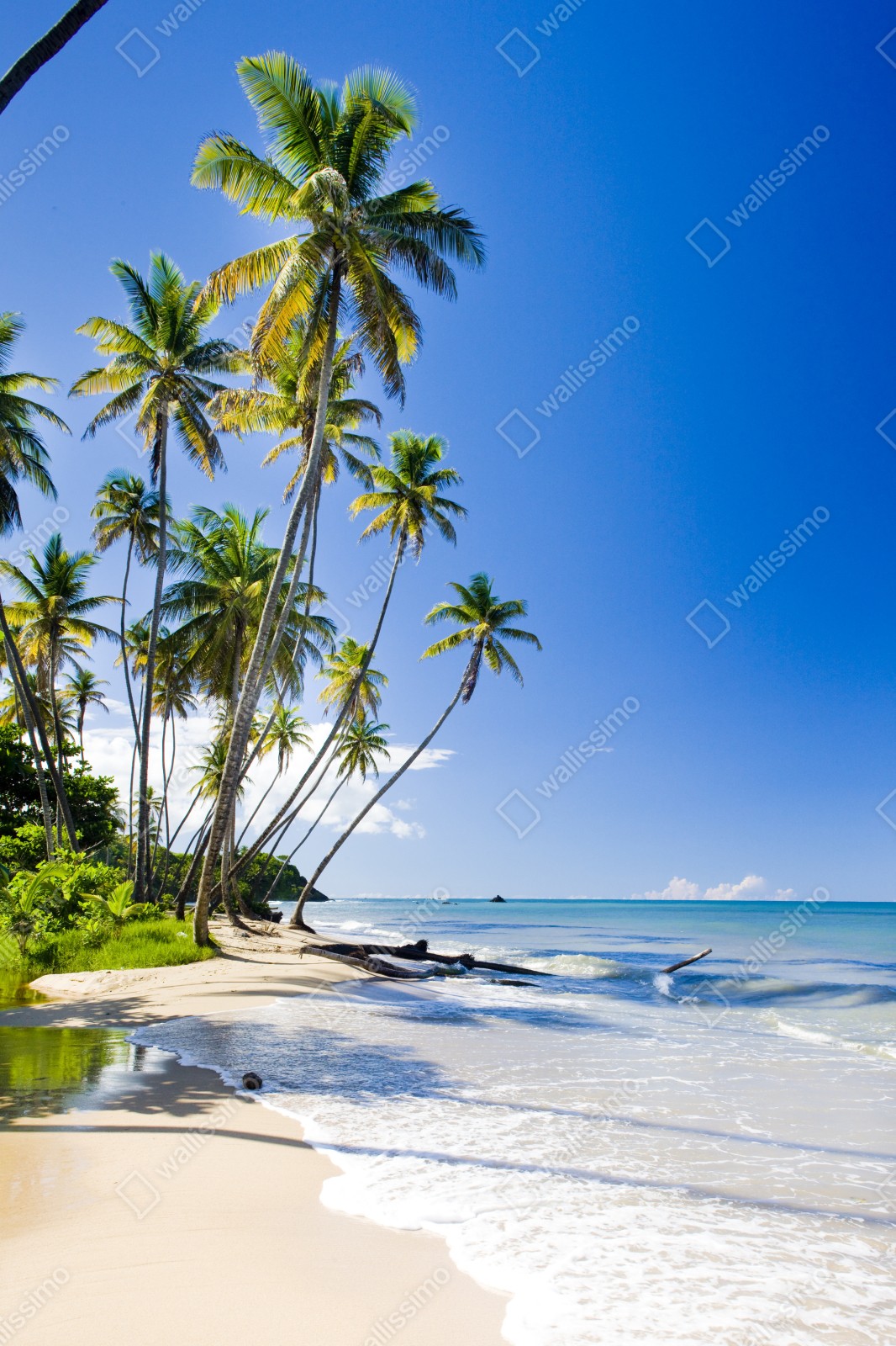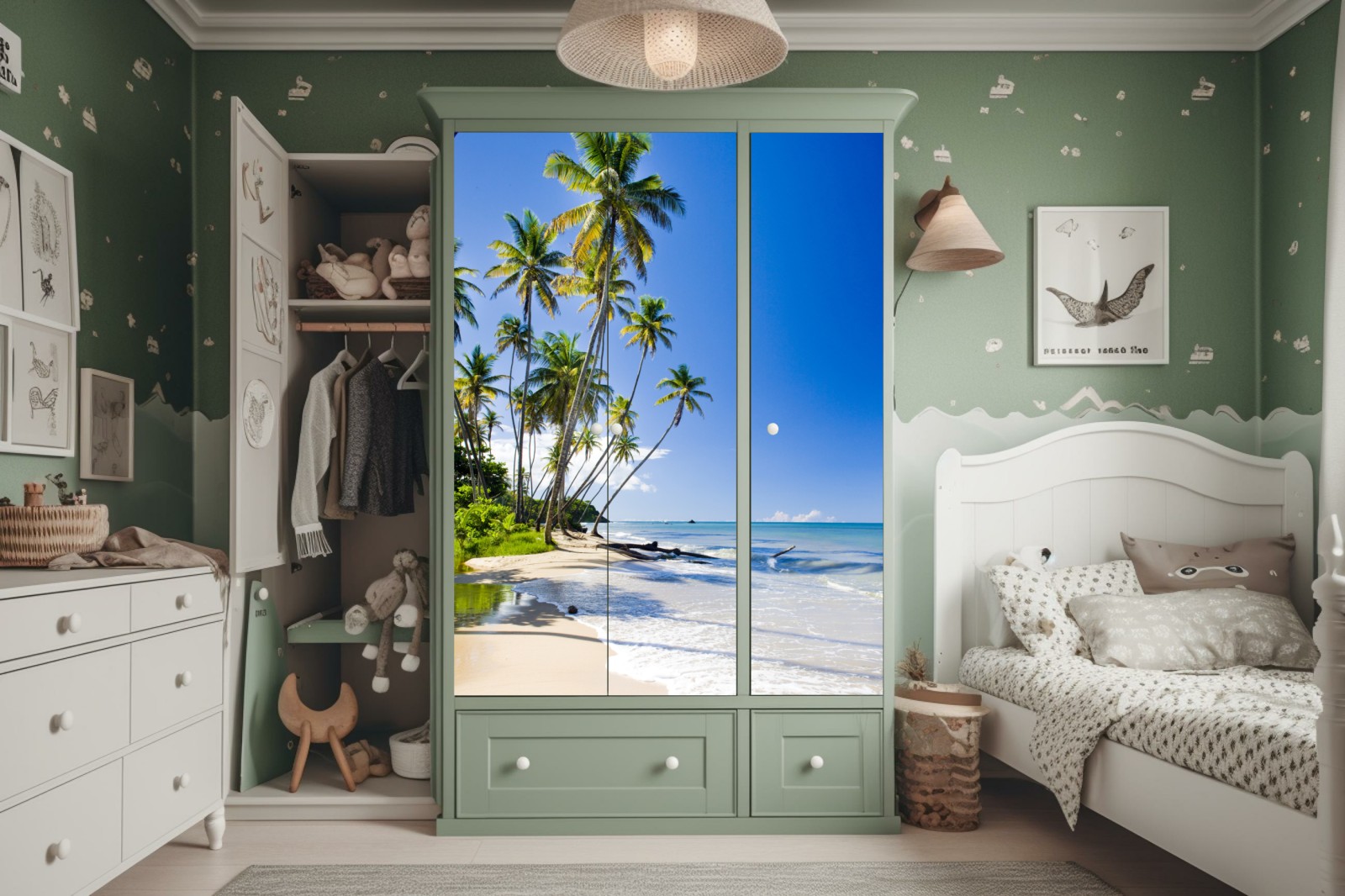 Naklejka na szafę Tropikalna plaża z palmami pod błękitnym niebem