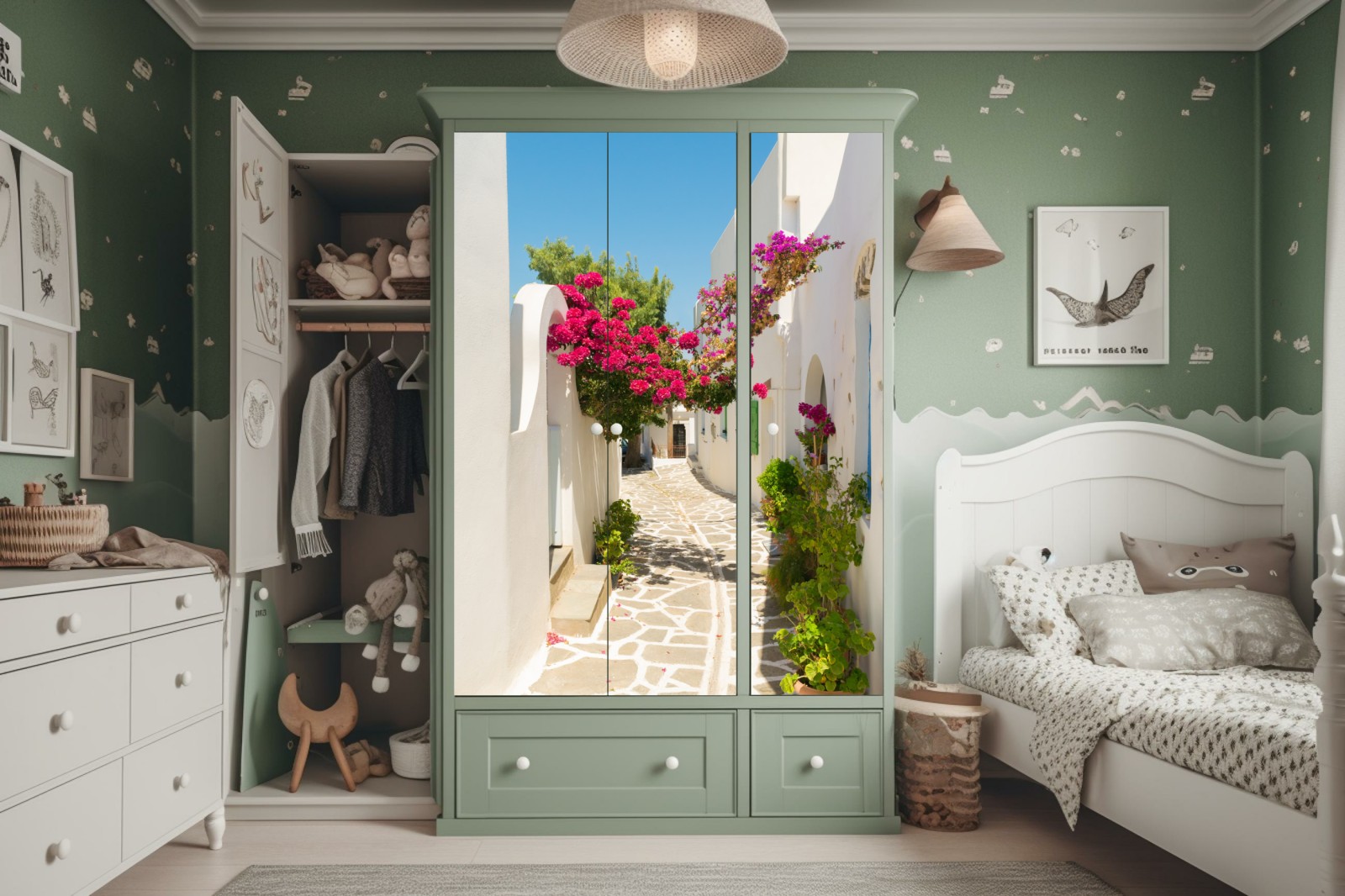 Naklejka na szafę Słoneczna śródziemnomorska uliczka z bugenwillą