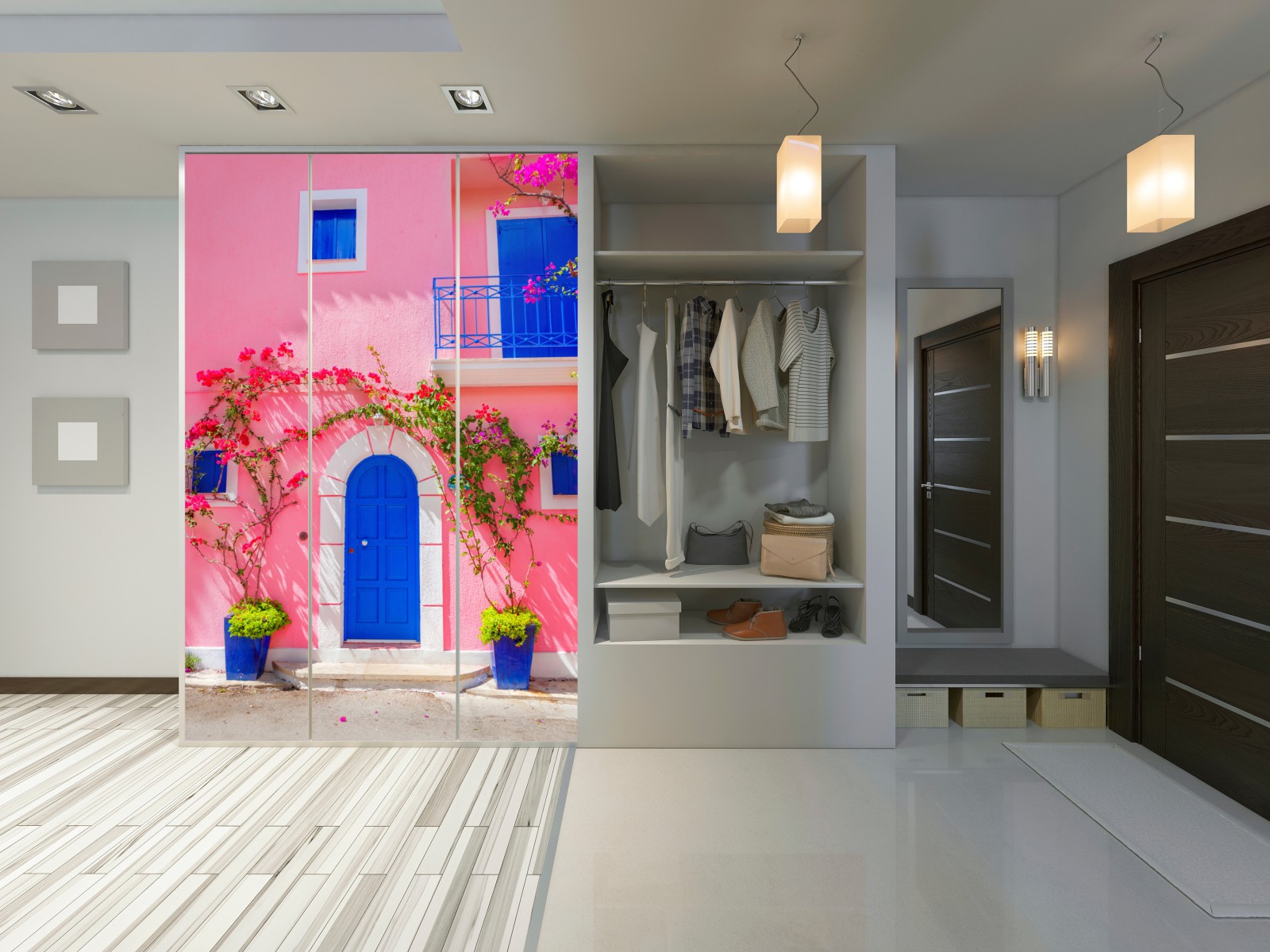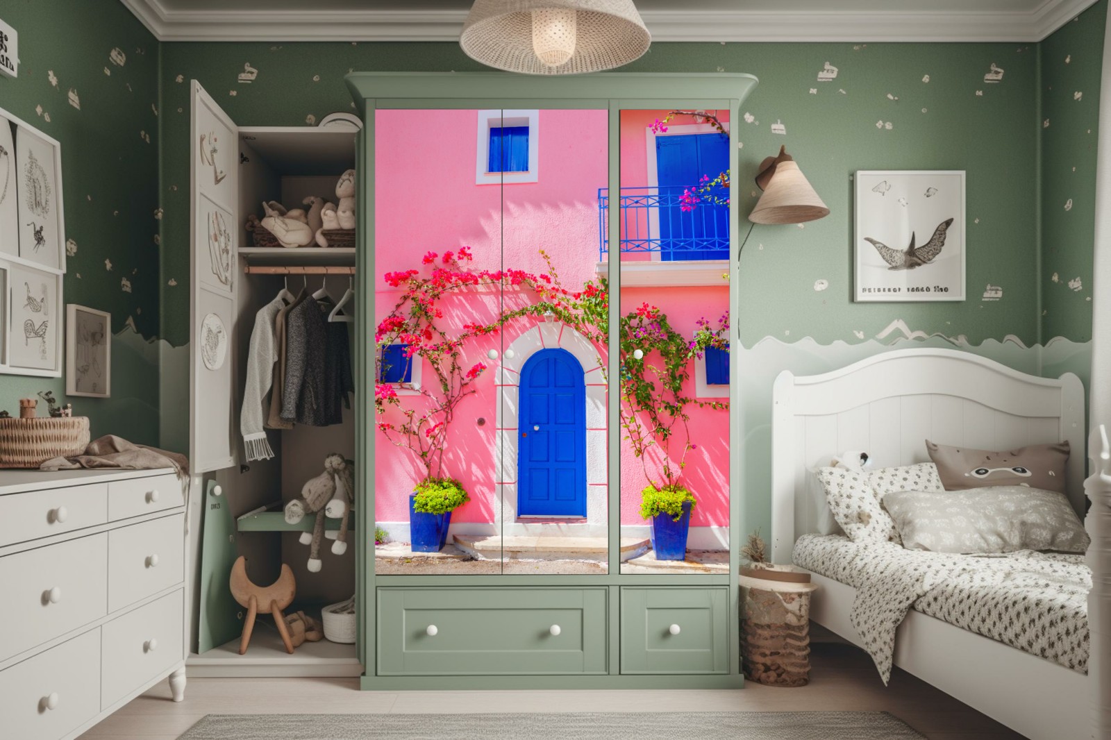 Naklejka na szafę Intensywna różowa fasada z niebieskimi drzwiami