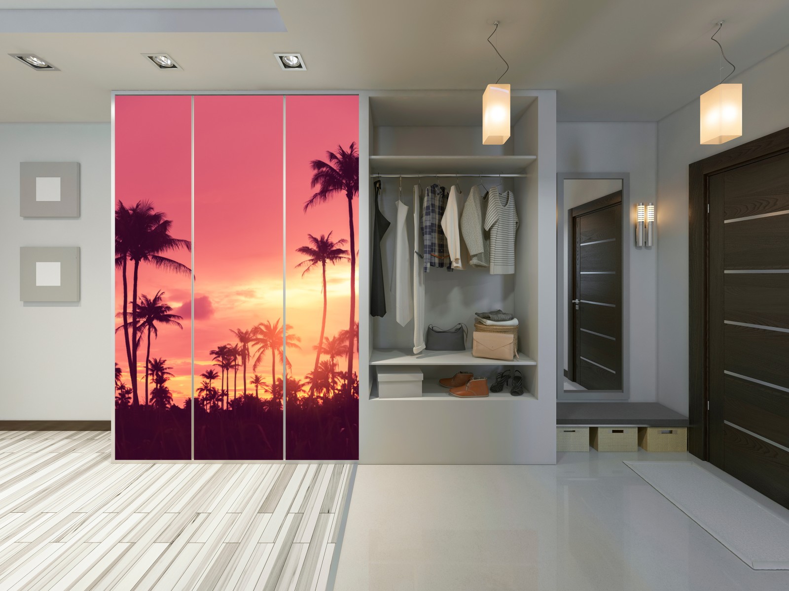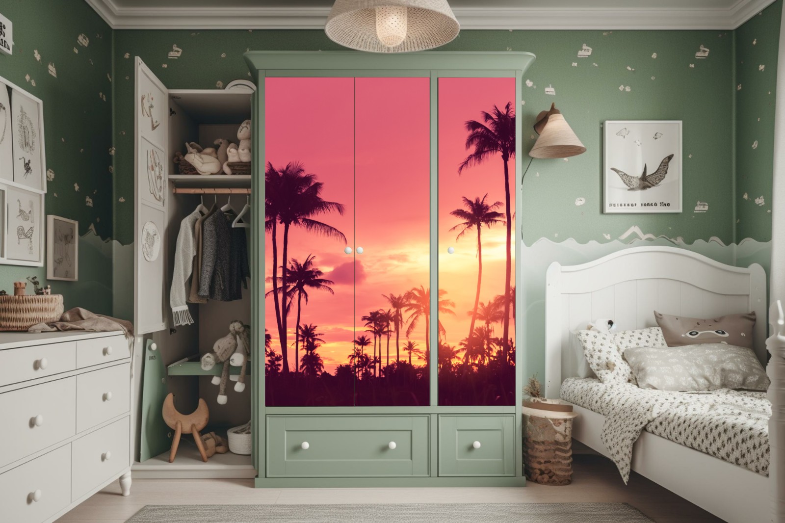 Naklejka na szafę Różowy tropikalny zachód słońca z palmami