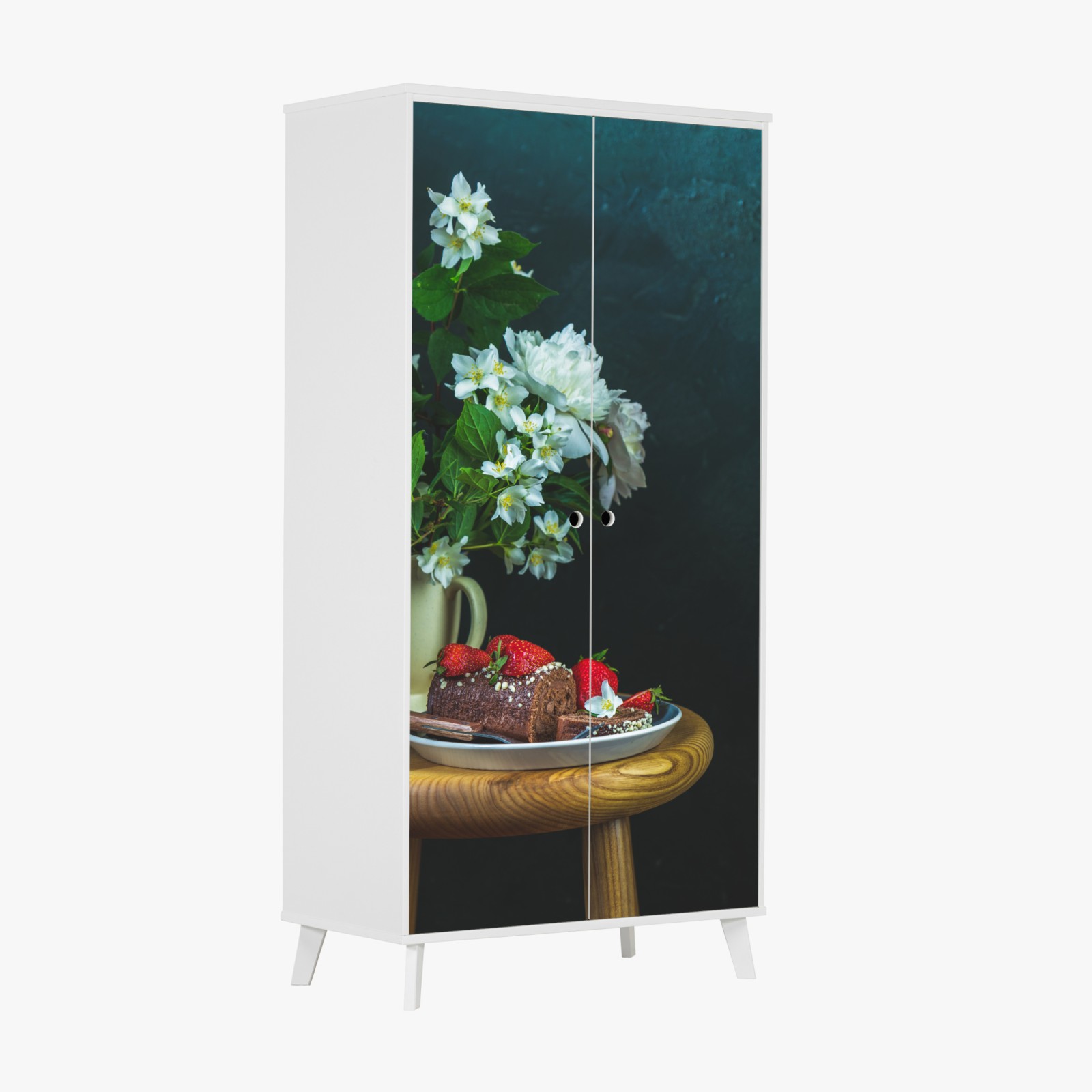 Naklejka na szafę Rolada czekoladowa z truskawkami i białymi kwiatami