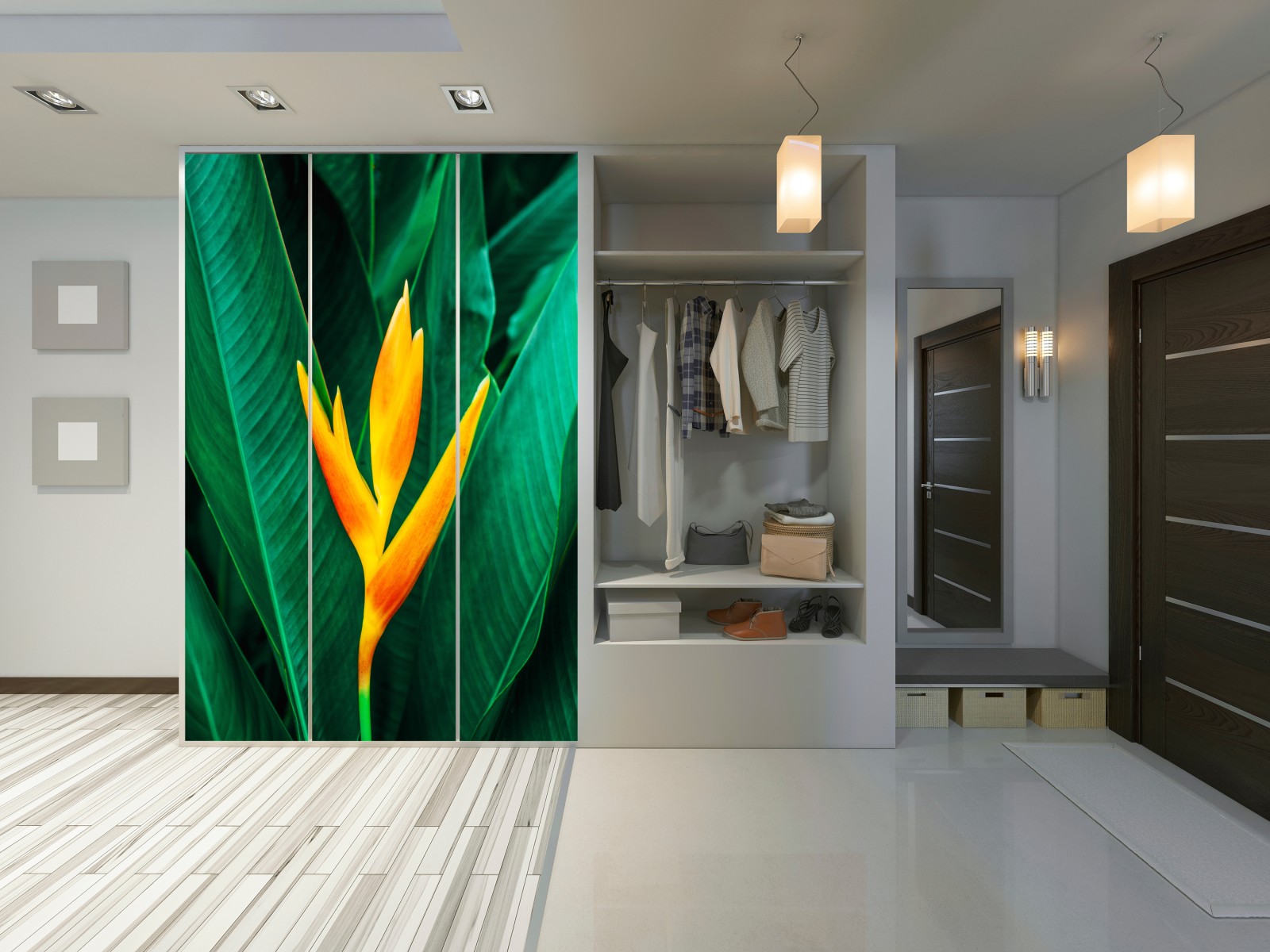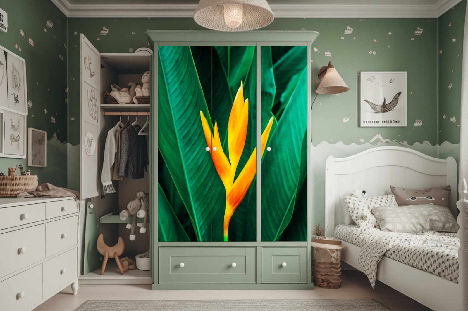 Naklejka na szafę Żywy tropikalny kwiat heliconia na tle zielonych liści