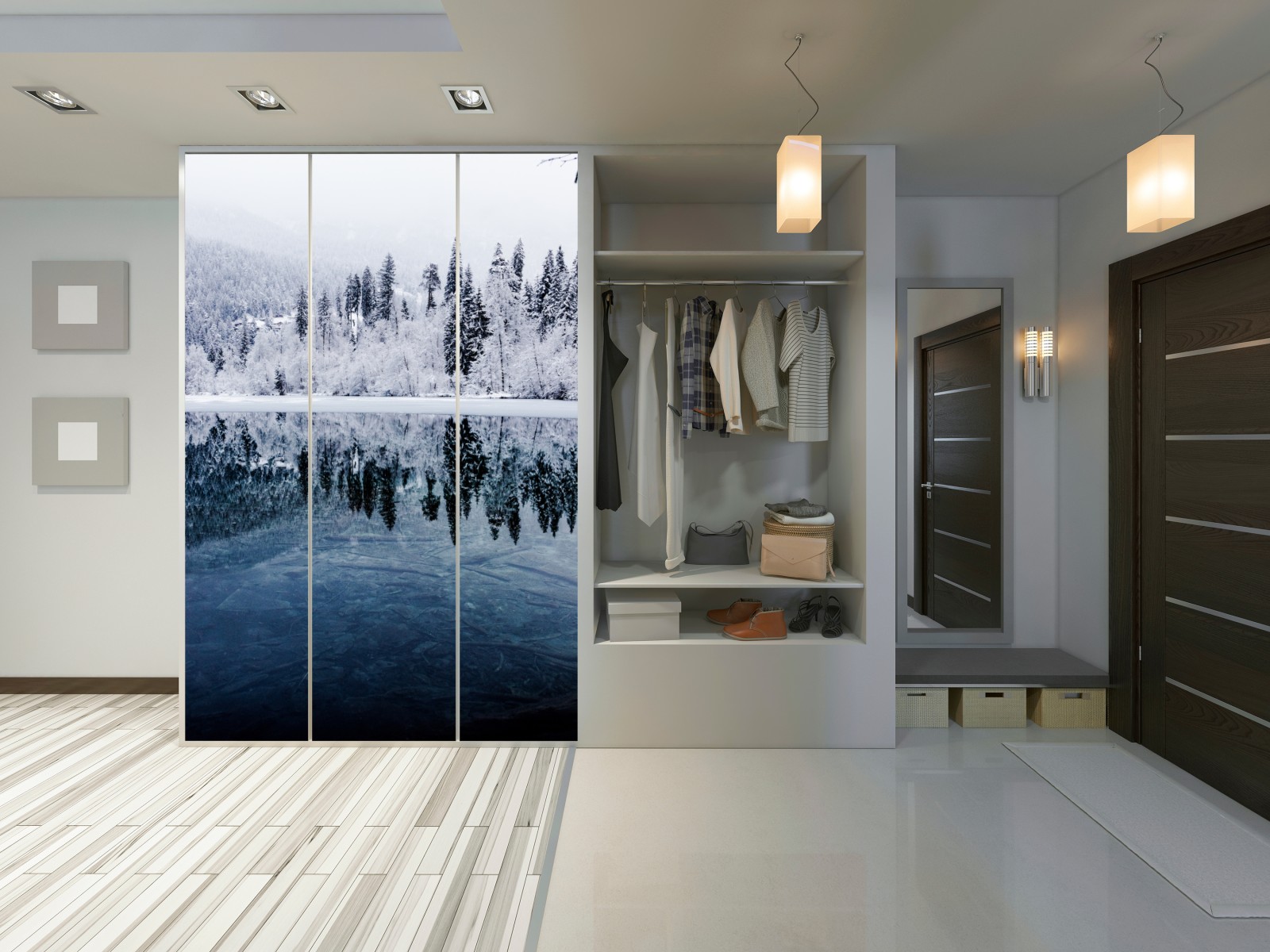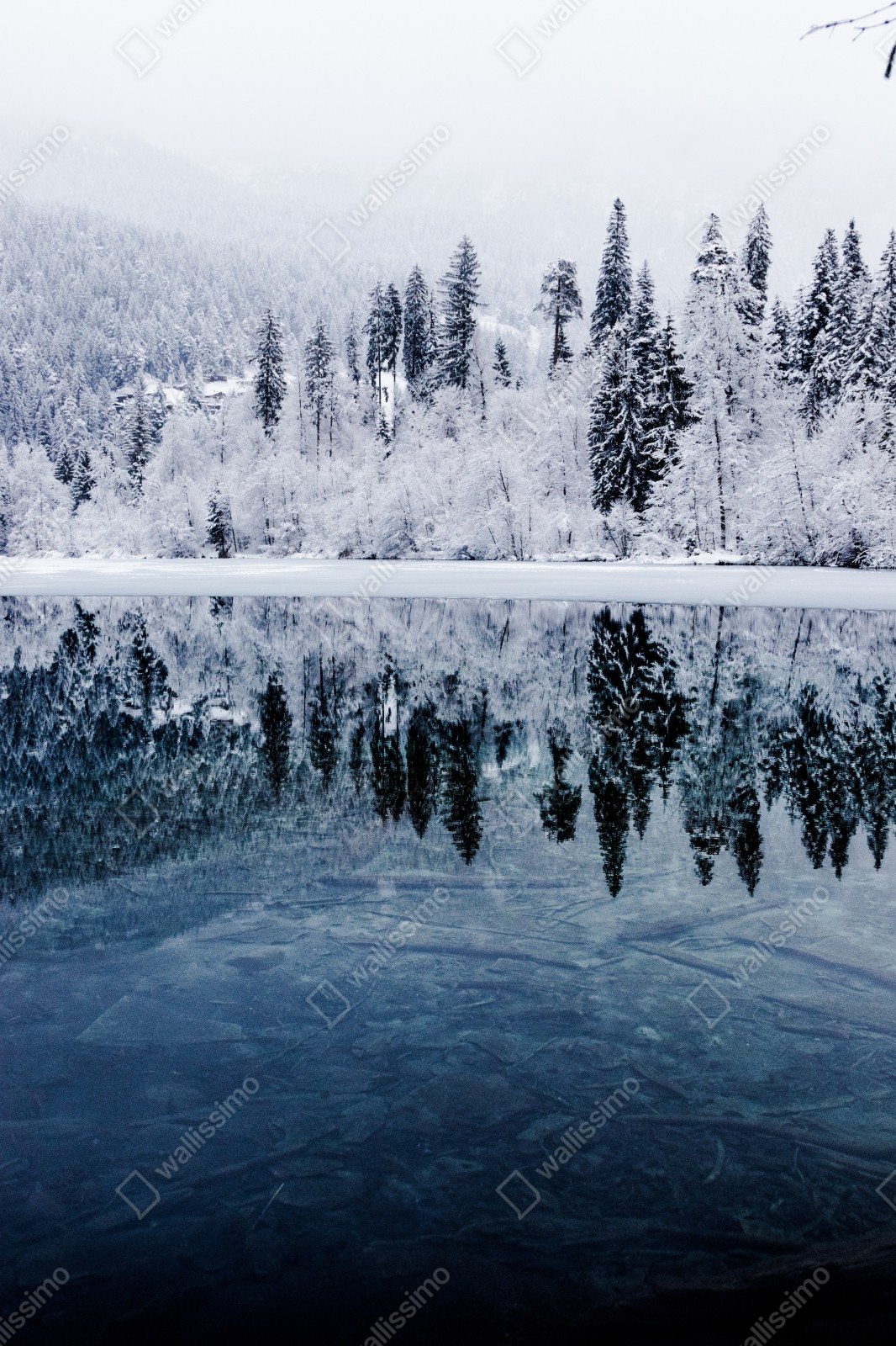 Naklejka na szafę Zimowe jezioro z odbiciem w śnieżnym lesie