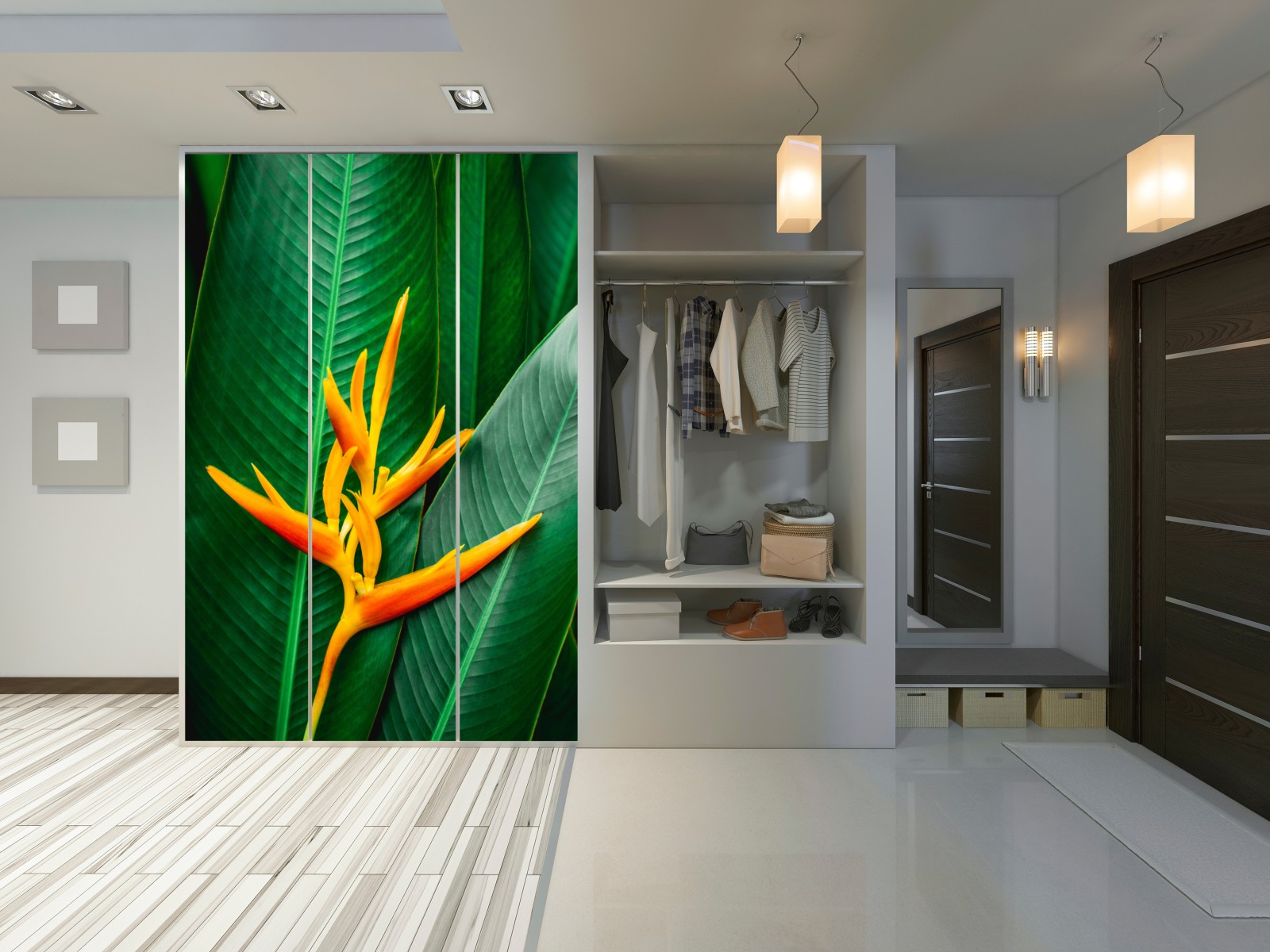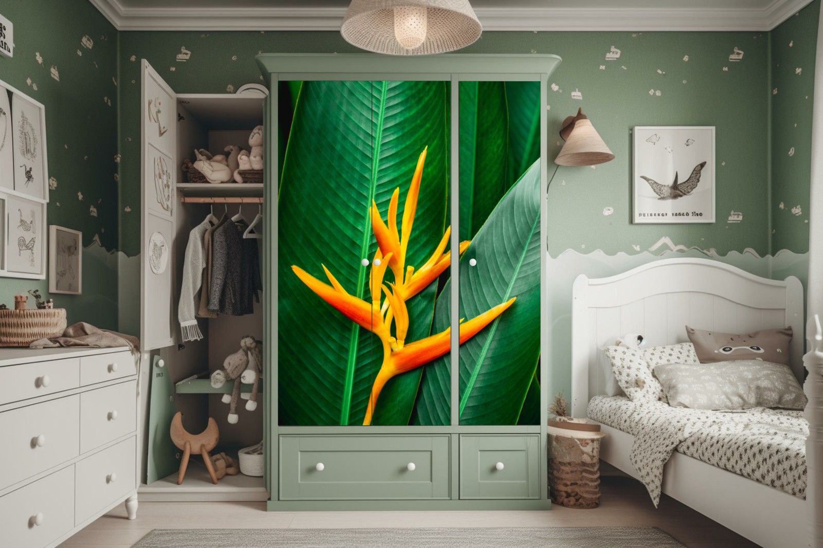 Naklejka na szafę Żywa heliconia na zielonych liściach