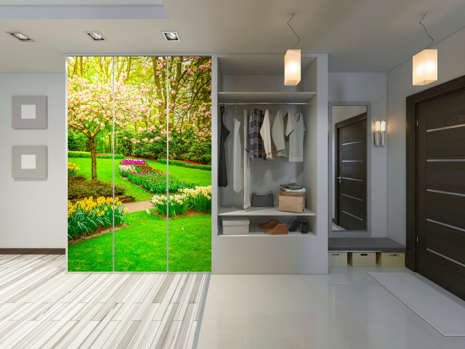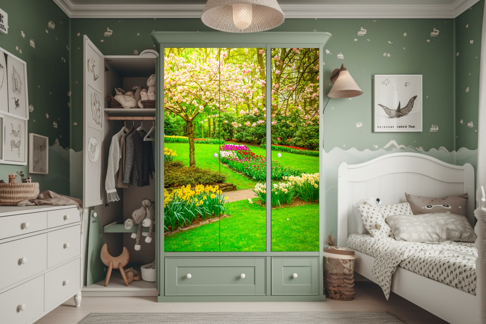 Naklejka na szafę Wiosenny ogród w rozkwicie: tulipany i kwiat wiśni