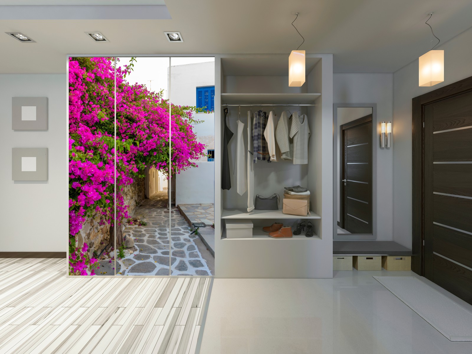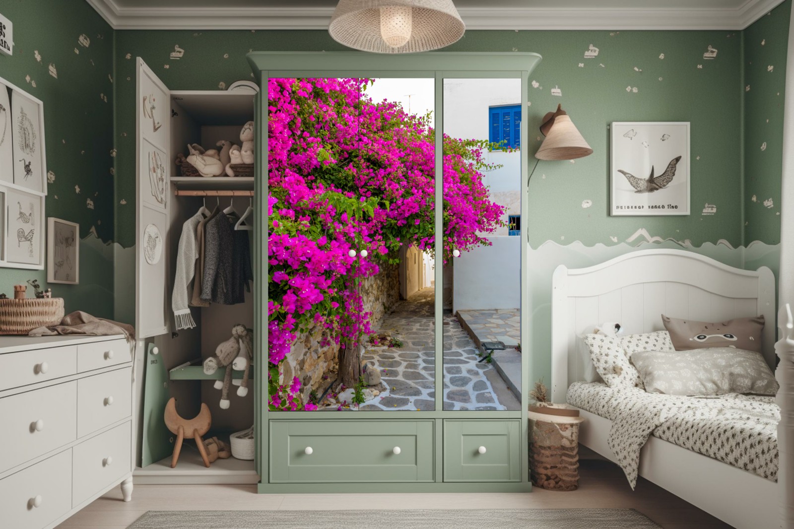 Naklejka na szafę Kwitnąca bugenwilla w uliczce Naousa
