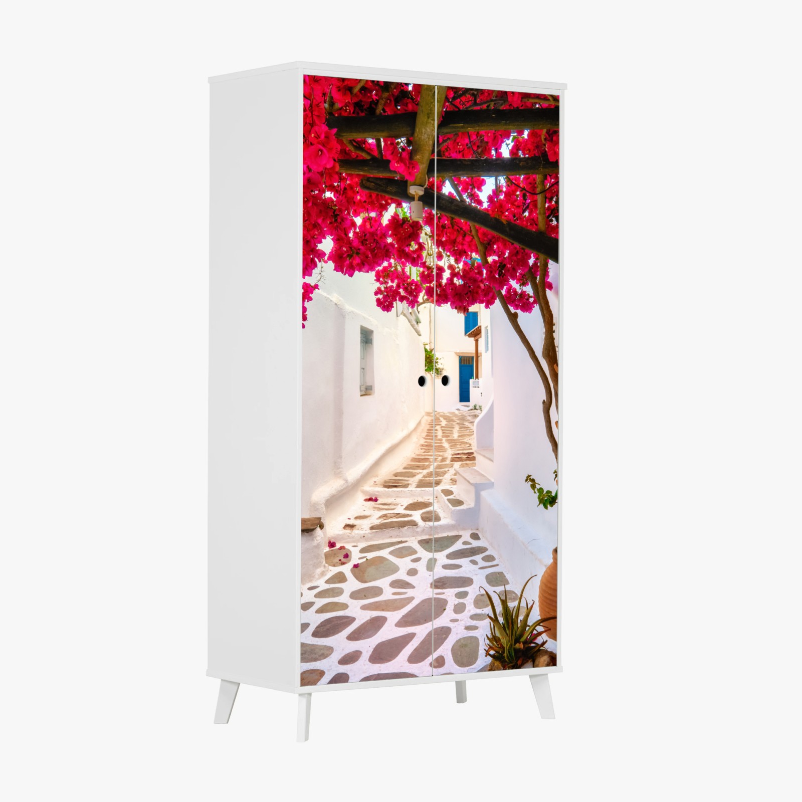 Naklejka na szafę Słoneczna uliczka grecka z bugenwillą