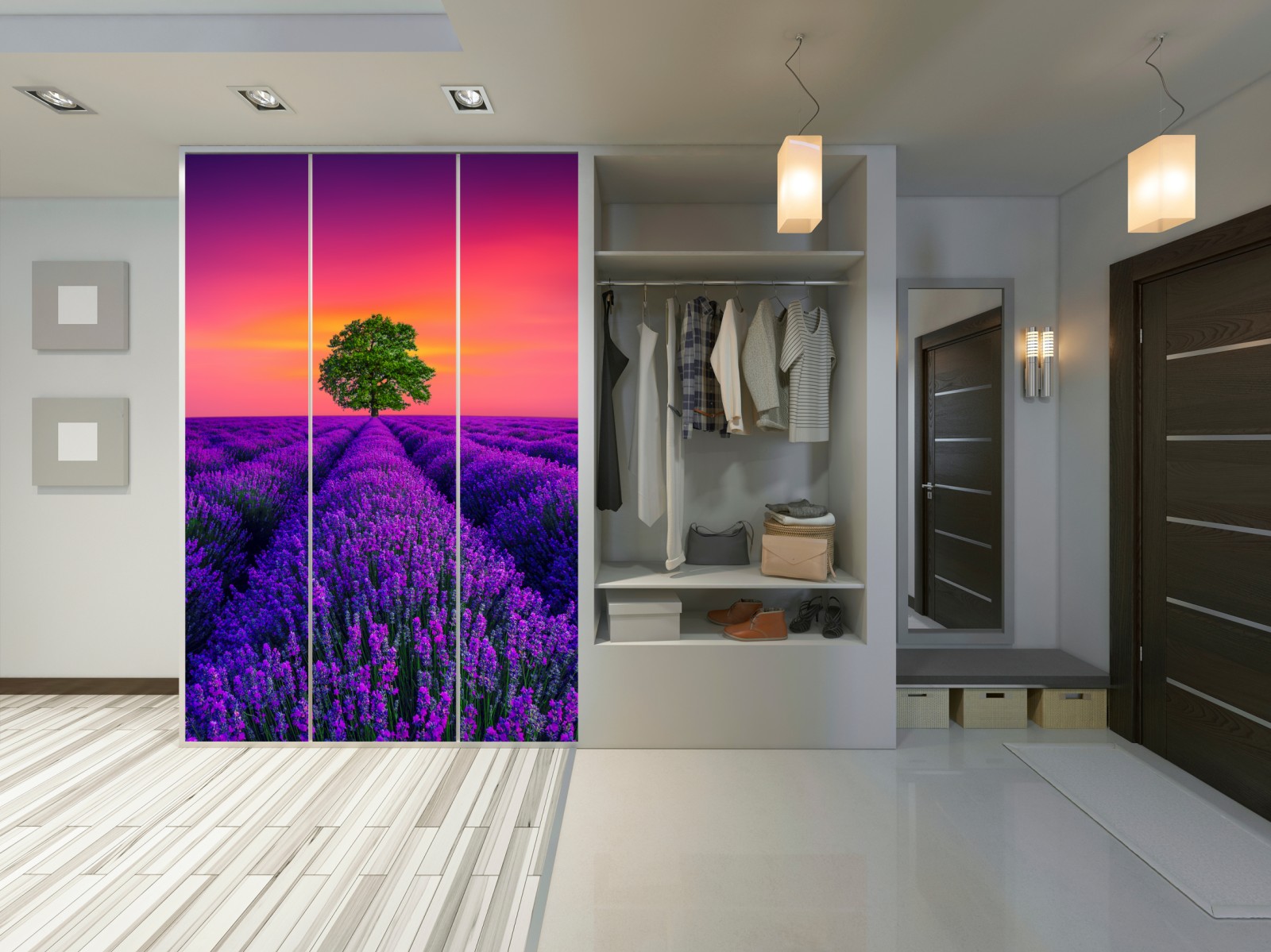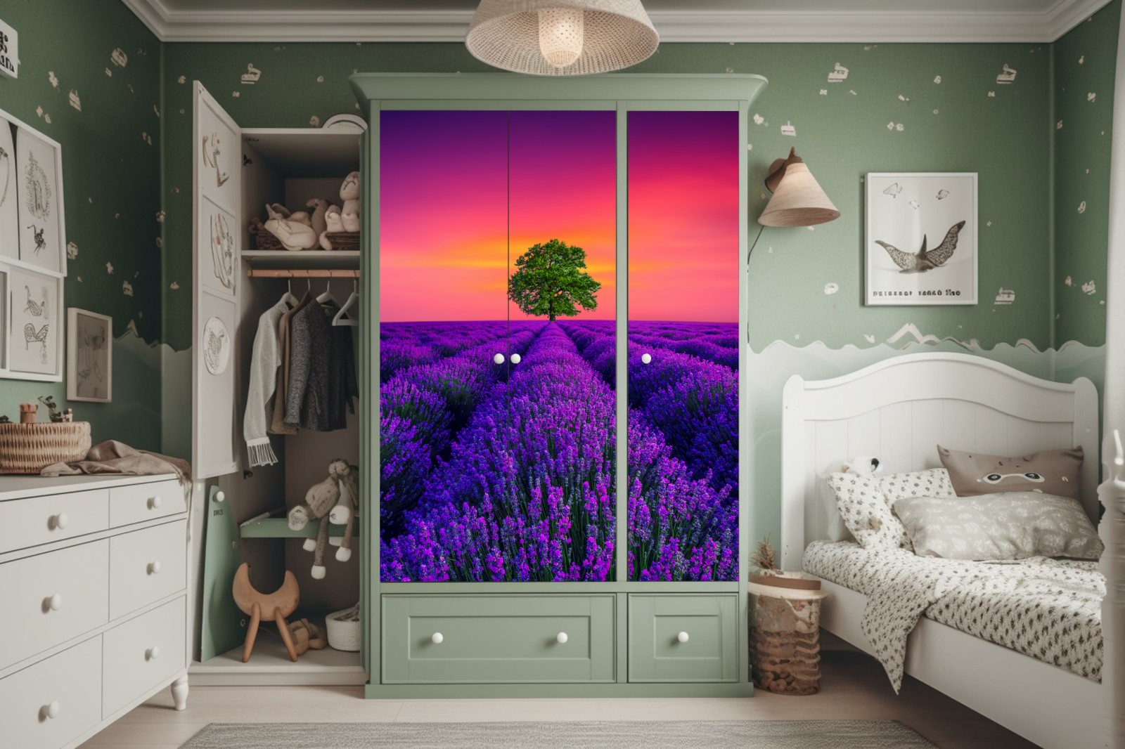 Naklejka na szafę Pole lawendy o zachodzie słońca z samotnym drzewem