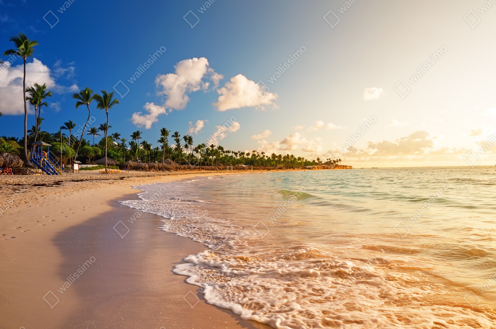 Naklejka na szafę Tropikalny zachód słońca na plaży z sylwetkami palm