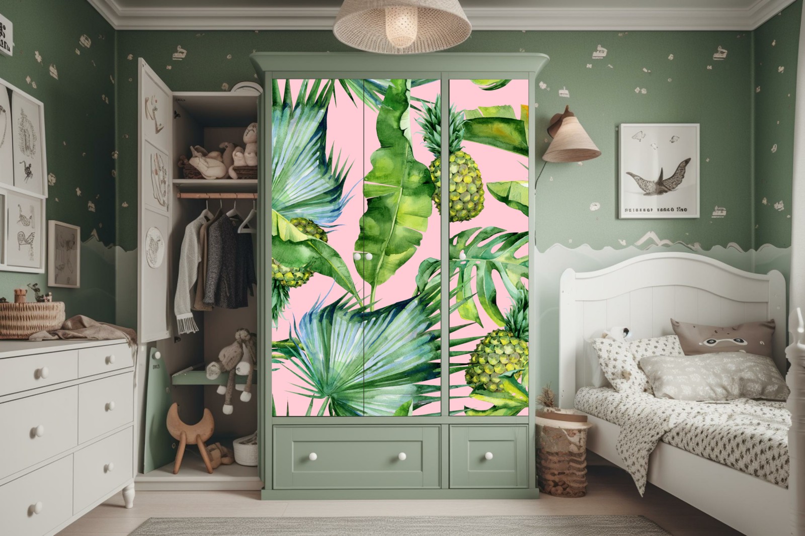 Naklejka na szafę Tropikalny wzór ananasów i liści w akwareli na różowym tle