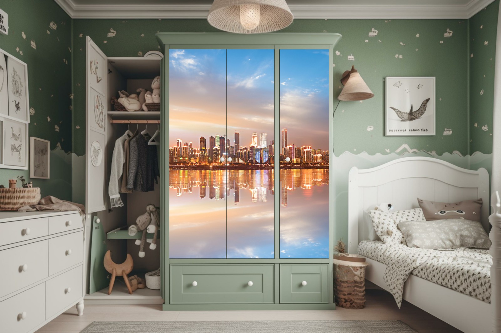 Naklejka na szafę Panorama miasta odbita w wodzie o zmierzchu