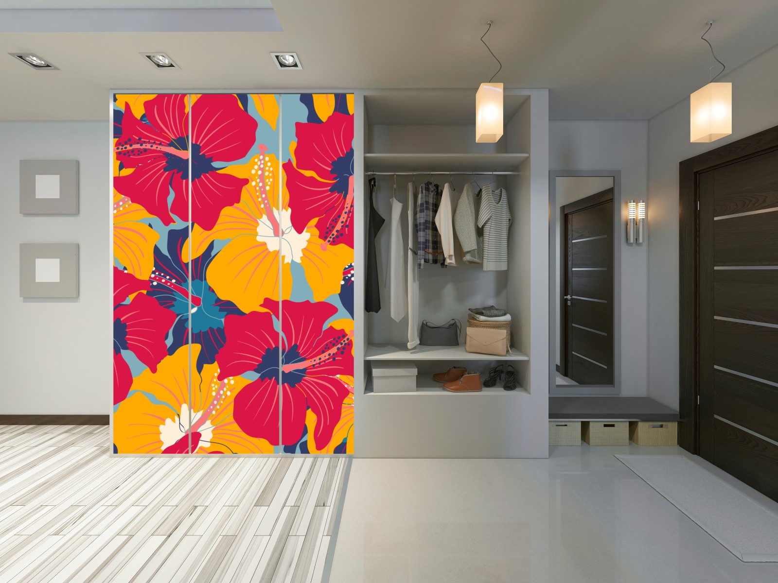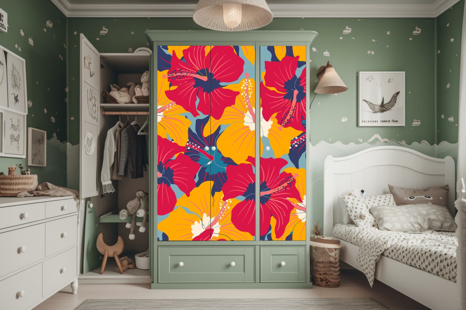 Naklejka na szafę Żywy wzór hibiskusa w stylu retro