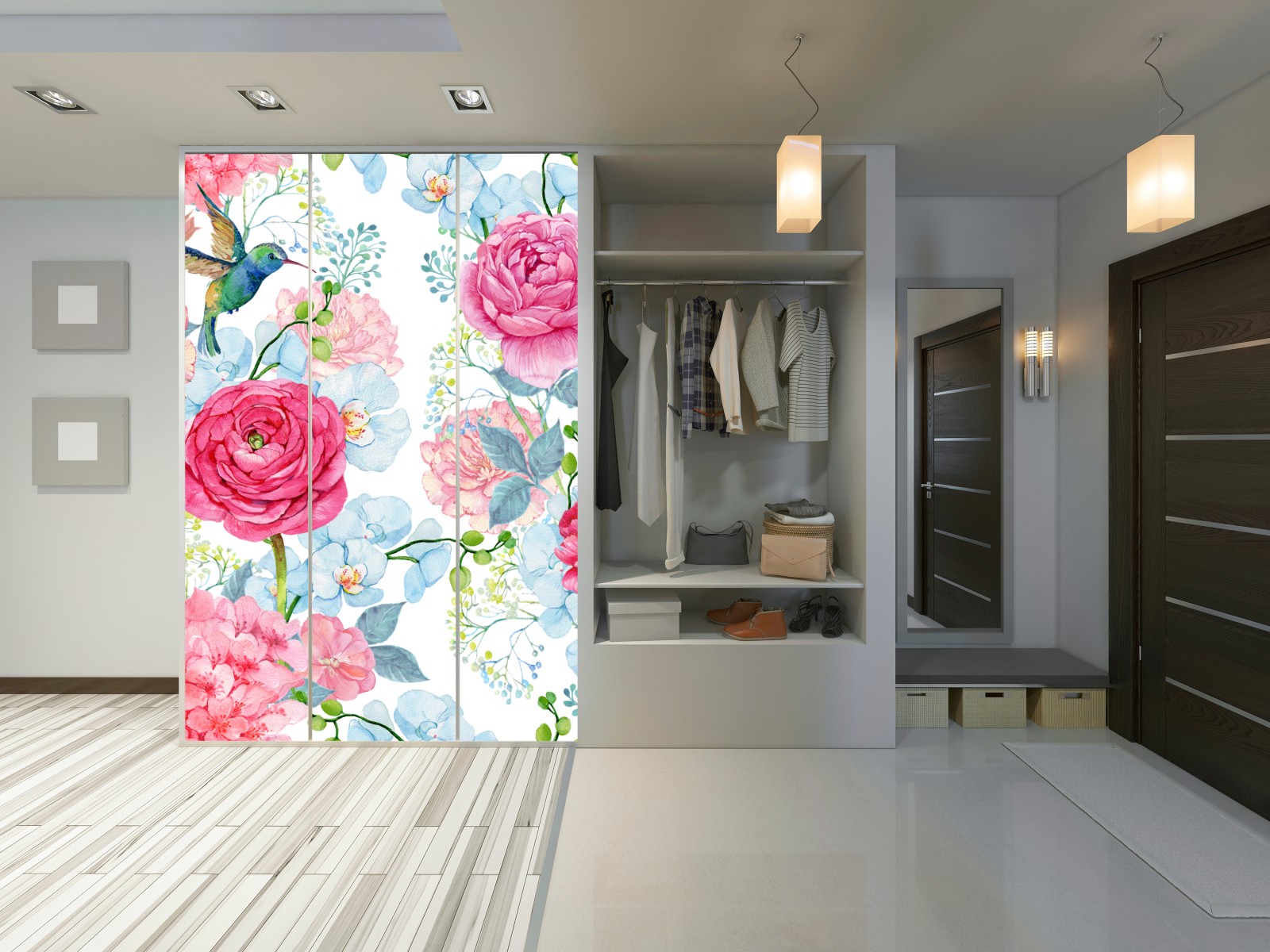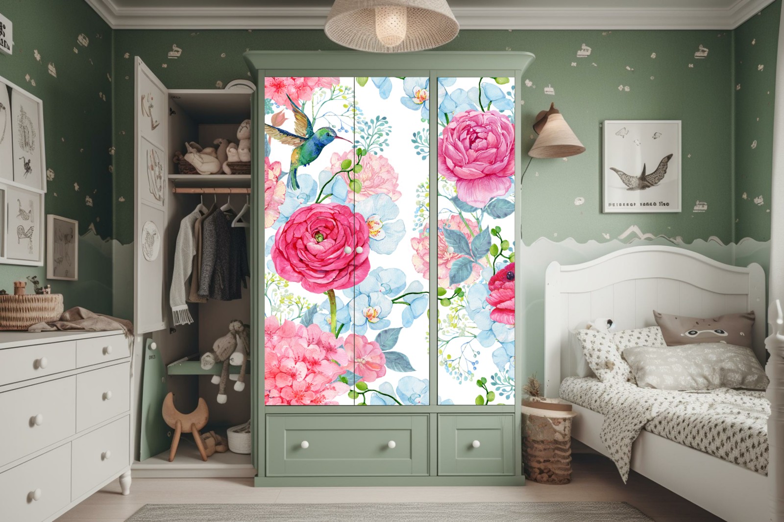 Naklejka na szafę Różany akwarelowy ogród z kolibrem