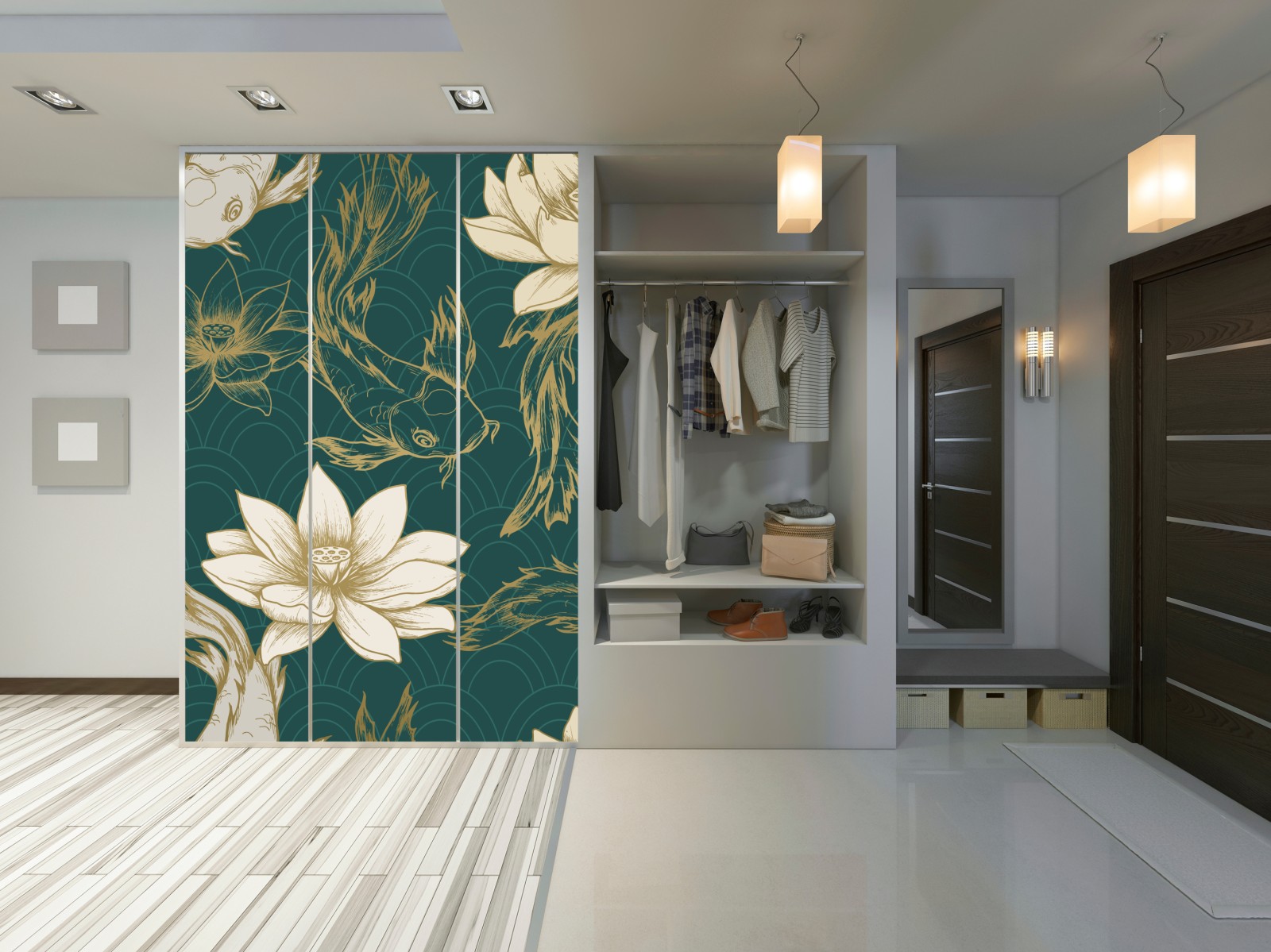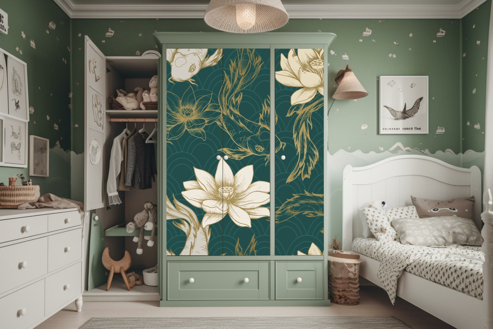 Naklejka na szafę Orientalny wzór koi i lotosów w turkusie i złocie