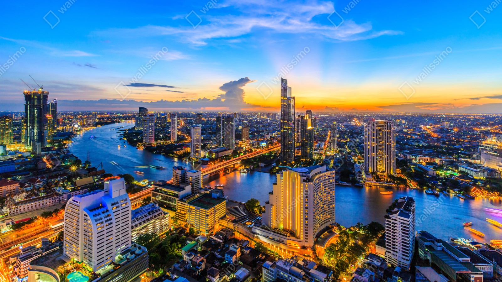 Naklejka na szafę Tętniąca życiem panorama miasta o zmierzchu