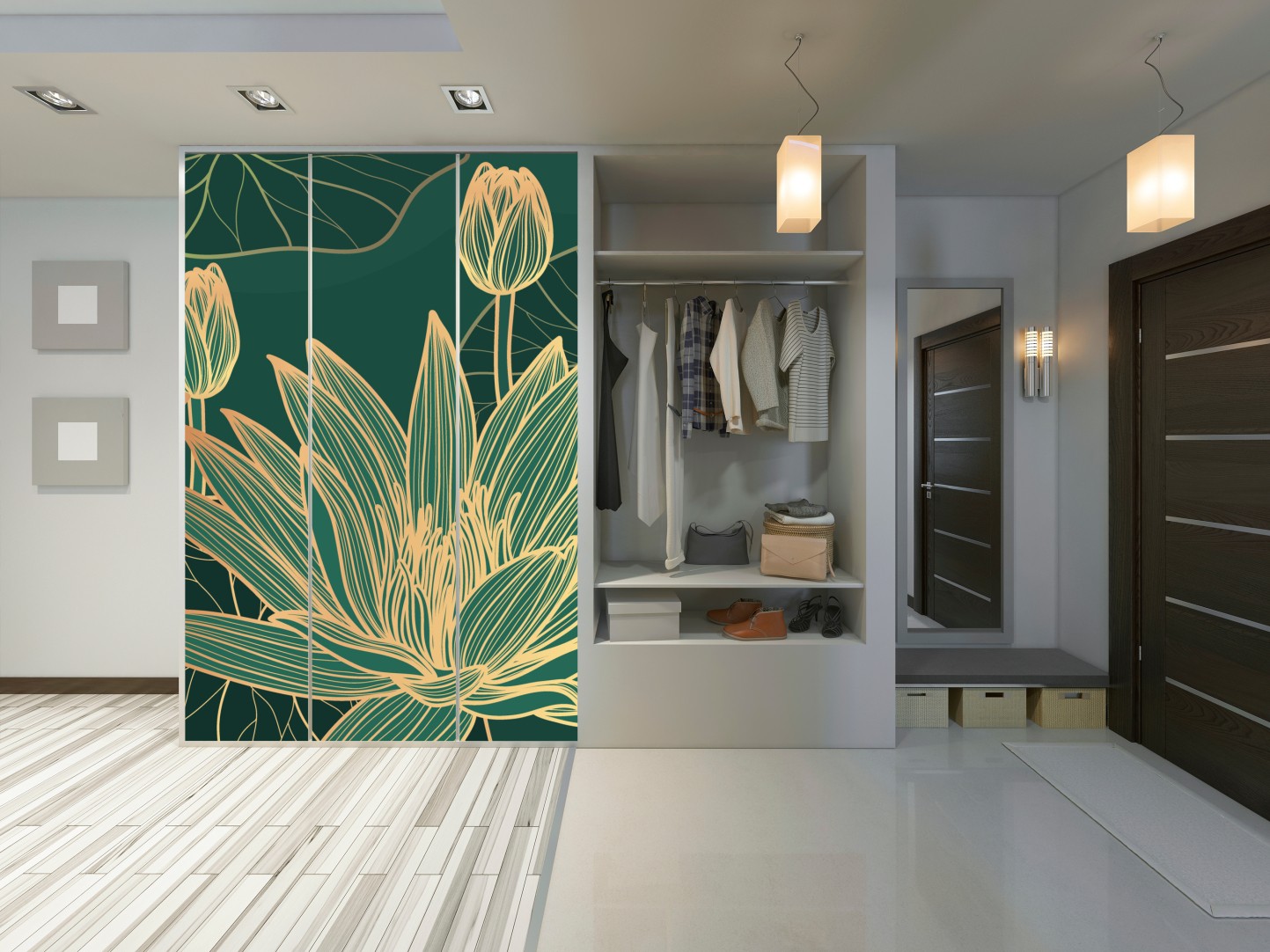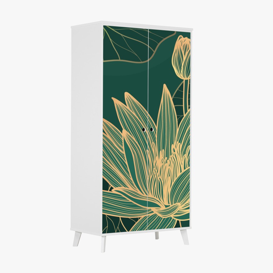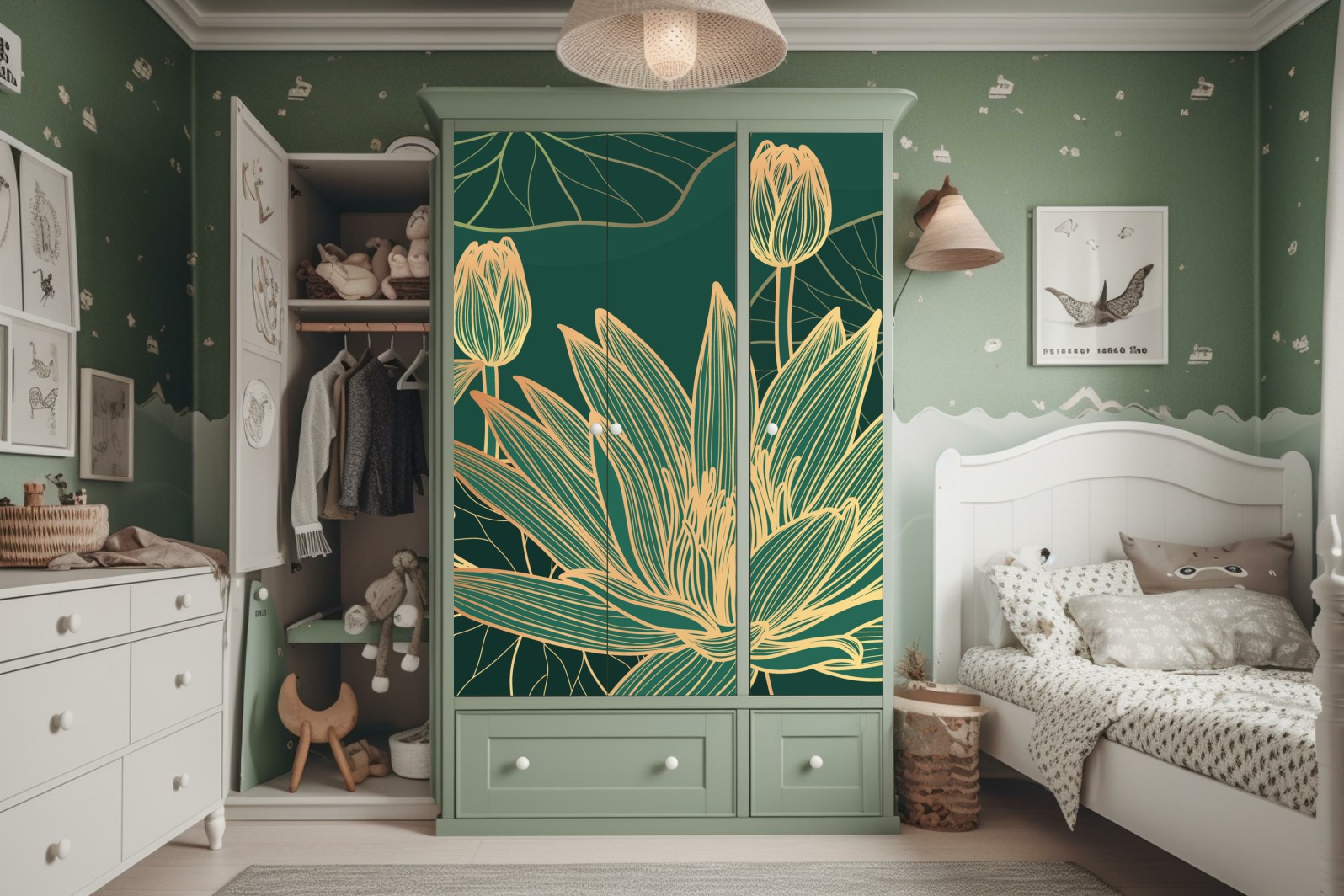 Naklejka na szafę Złote kwiaty lotosu na zielonym tle